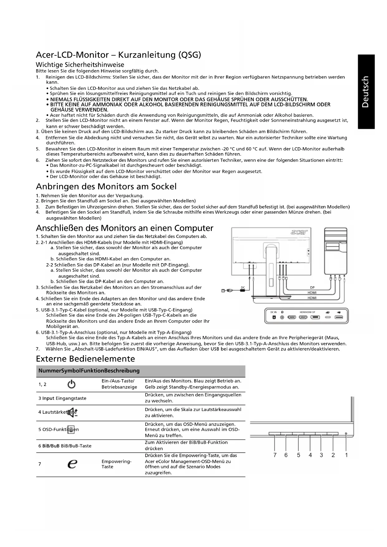 3. Zum Befestigen im Uhrzeigersinn drehen. Stellen Sie sicher, dass der Sockel sicher auf dem Standfuß befestigt ist. (bei ausgewählten Modellen) 4. Befestigen Sie den Sockel am Standfuß, indem Sie die Schraube mithilfe eines Werkzeugs oder einer passenden Münze drehen. (bei ausgewählten Modellen) Anschließen des Monitors an einen Computer 1. Schalten Sie den Monitor aus und ziehen Sie das Netzkabel des Computers ab.2. 2-1 Anschließen des HDMI-Kabels (nur Modelle mit HDMI-Eingang)a. Stellen Sie sicher, dass sowohl der Monitor als auch der Computer ausgeschaltet sind.b. Schließen Sie das HDMI-Kabel an den Computer an.2-2 Schließen Sie das DP-Kabel an (nur Modelle mit DP-Eingang).a. Stellen Sie sicher, dass sowohl der Monitor als auch der Computer ausgeschaltet sind.b. Schließen Sie das DP-Kabel an den Computer an.3. Schließen Sie das Netzkabel des Monitors an den Stromanschluss auf der Rückseite des Monitors an.4. Schließen Sie ein Ende des Adapters an den Monitor und das andere Ende an eine sachgemäß geerdete Steckdose an.5. USB-3.1-Typ-C-Kabel (optional, nur Modelle mit USB-Typ-C-Eingang)Schließen Sie das eine Ende des 24-poligen USB-Typ-C-Kabels an die Rückseite des Monitors und das andere Ende an Ihrem Computer oder Ihr Mobilgerät an.6. USB-3.1-Typ-A-Anschluss (optional, nur Modelle mit Typ-A-Eingang) Schließen Sie das eine Ende des Typ-A-Kabels an einen Anschluss Ihres Monitors und das andere Ende an Ihre Peripheriegerät (Maus, USB-Hub, usw.) an. Bitte befolgen Sie zuerst die vorherige Anweisung, bevor Sie den USB-3.1-Typ-A-Anschluss des Monitors verwenden. 7. Wählen Sie „Abschalt-USB-Ladefunktion EIN/AUS“, um das Aufladen über USB bei ausgeschaltetem Gerät zu aktivieren/deaktivieren. Externe Bedienelemente Nummer Symbol Funktion Beschreibung 1, 2 Ein-/Aus-Taste/BetriebsanzeigeEin/Aus des Monitors. Blau zeigt Betrieb an. Gelb zeigt Standby-/Energiesparmodus an.3 Input EingangstasteDrücken, um zwischen den Eingangsquellen zu wechseln.4 LautstärketasteDrücken, um die Skala zur Lautstärkeauswahl zu aktivieren.5 OSD-FunktionenDrücken, um das OSD-Menü anzuzeigen. Erneut drücken, um eine Auswahl im OSD-Menü zu treffen.6 BiB/BuB BiB/BuB-TasteZum Aktivieren der BiB/BuB-Funktion drücken Empowering-TasteDrücken Sie die Empowering-Taste, um das Acer eColor Management-OSD-Menü zu öffnen und auf die Szenario Modes zuzugreifen. HDMIHDMI DP