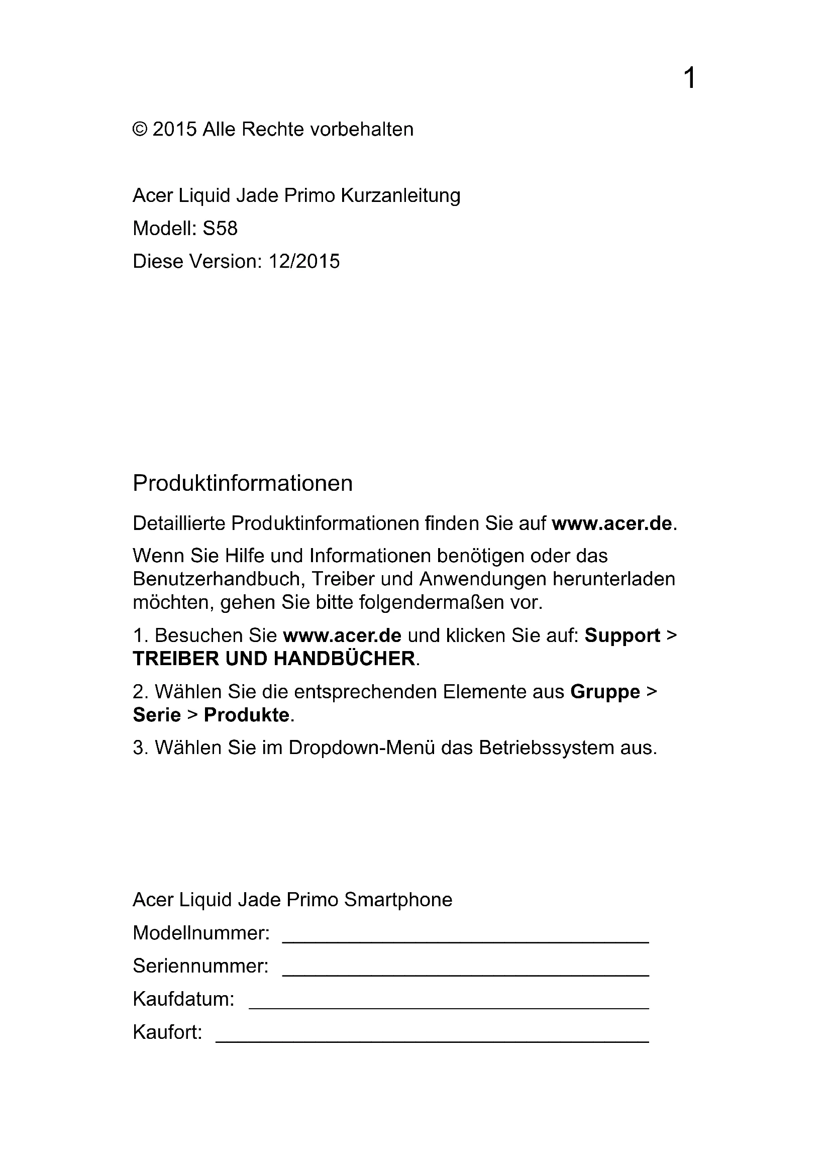 Nano SIM 2 Nano SIM 1 oder microSD microSDCard SIM16 Deutsch Laden des Telefons Vor der ersten Verwendung muss das Smartphone acht Stunden lang geladen werden. Anschließend können Sie den Akku falls nötig wieder laden. Schließen Sie das AC-Adapterkabel an den Micro- USB-Anschluss des Smartphones an. Schließen Sie das Netzteil an eine Netzsteckdose an und laden Sie das Gerät auf. Es ist normal, dass sich das Telefon während des Ladevorgangs und während längerer Bedienung erhitzt. Alle Telefone werden vor der Herausgabe intensiv getestet.7 Deutsch Das Telefon zurücksetzen und neu starten Öffnen Sie Einstellungen aus der Apps Liste und tippen Sie anschließend auf System > Info. Tippen Sie auf Handy zurücksetzen und anschließend zwei Mal auf Ja, um Ihr Telefon zurückzusetzen. Wenn das Telefon nicht mehr reagiert, halten Sie die Ein/Aus-Taste 15 Sekunden lang gedrückt, um das Telefon herunterzufahren. Halten Sie die Ein/Aus- Taste länger als 15 Sekunden gedrückt, um es neu zu starten. Hinweis: Führen Sie diesen Vorgang nicht durch, wenn das Telefon aufgeladen wird. Trennen Sie zuerst das Ladegerät ab.1 English Productinformatie Voor gedetailleerdere productgegevens, ga naar www.acer.com. Voor informatie over dienstverlening en ondersteuning, of om de gebruikershandleiding, stuurprogramma’s en toepassingen te downloaden, volgt u onderstaande instructies: