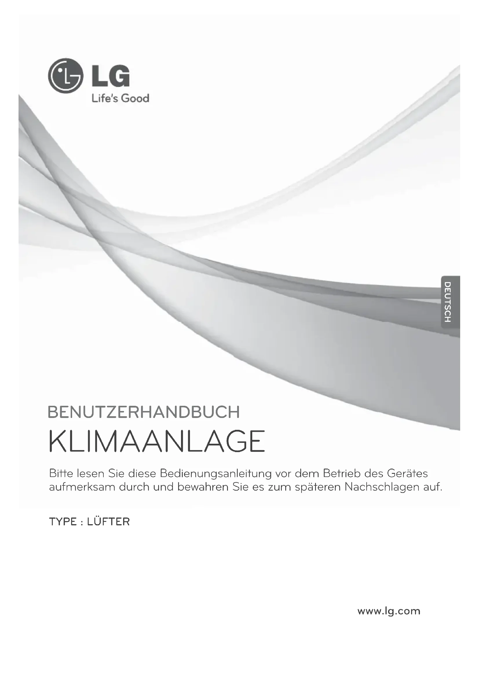 Setzen Sie die Abdeckung in das rechte Scharnier und befestigen Sie sie an der linken Seite. (Die Ausrichtung der Abdeckung ist auf dem Typenschild angegeben). ACHTUNG: Vor der Reinigung des Gerätes den Überlastungsschalter unterbrechen. VORSICHT: Bei Wartungsarbeiten sollten stets Arbeitshandschuhe getragen werden.22 Lüfter Störungsbehebung vor einem Anruf beim Kundendienst Störungsbehebung vor einem Anruf beim Kundendienst Das Gerät arbeitet nicht Das Gerät schaltet sich nicht ein, auch nicht beim Drücken der Taste 'EIN' Auch nach dem Ändern der Raumluftmenge wird der Betriebsmodus nicht geändert und die Einstellung ändert sich nach 'Auto' oder ʻNiedrig'. Ist keine Stromversorgung vorhanden? Sind der Luftfilter oder der Gesamt-Wärmetauscher stark verstopft? Liegt die Raumtemperatur unterhalb von -10°c oder oberhalb von 45°C? Liegt die Raumtemperatur unterhalb von -10°C oder oberhalb von 45°C? Stromversorgung herstellen Führen Sie die Anleitung zur Reinigung und Wartung aus. Zum Schutz des Gesamt- Wärmetauschers wurde das Gerät in den Bereitschaftsmodus versetzt. Zum Schutz des Gesamt- Wärmetauschers wurde das Gerät in den Normalbetrieb versetzt. Störung Überprüfen BehebungΕΓΧΕΙΡΙΔΙΟ ΧΡΗΣΤΗ ΚΛΙΜΑΤΙΣΤΙΚΌ ΔΩΜΑΤΙΟΥ Παρακαλούμε, διαβάστε με προσοχή το παρόν εγχειρίδιο, πριν θέσετε σε λειτουργία το σετ, και φυλάξτε το για μελλοντική αναφορά. www.lg.com Τύπος : Κλιματιστικό ΕΛΛΗΝΙΚΆ2 Κλιματιστικό Εγχειρίδιο χρήστη ΠΙΝΑΚΑΣ ΠΕΡΙΕΧΟΜΕΝΩΝ ΓΙΑ ΤΑ ΑΡΧΕΙΑ ΣΑΣ Γράψτε το μοντέλο και το σειριακό αριθμό εδώ:Μοντέλο #Σειριακός αριθμός #Μπορείτε να τα βρείτε στην ετικέτα στο πλαϊνό τμήματης μονάδας.Όνομα εμπόρουΗμερομηνία αγοράςn Συράψτε την απόδειξη σας σε αυτή τη σελίδα σε περί-πτωση που χρειαστεί να αποδείξετε την ημερομηνίααγοράς ή για ζητήματα σχετικά με την εγγύηση. ΔΙΑΒΑΣΤΕ ΤΟ ΠΑΡΟΝ