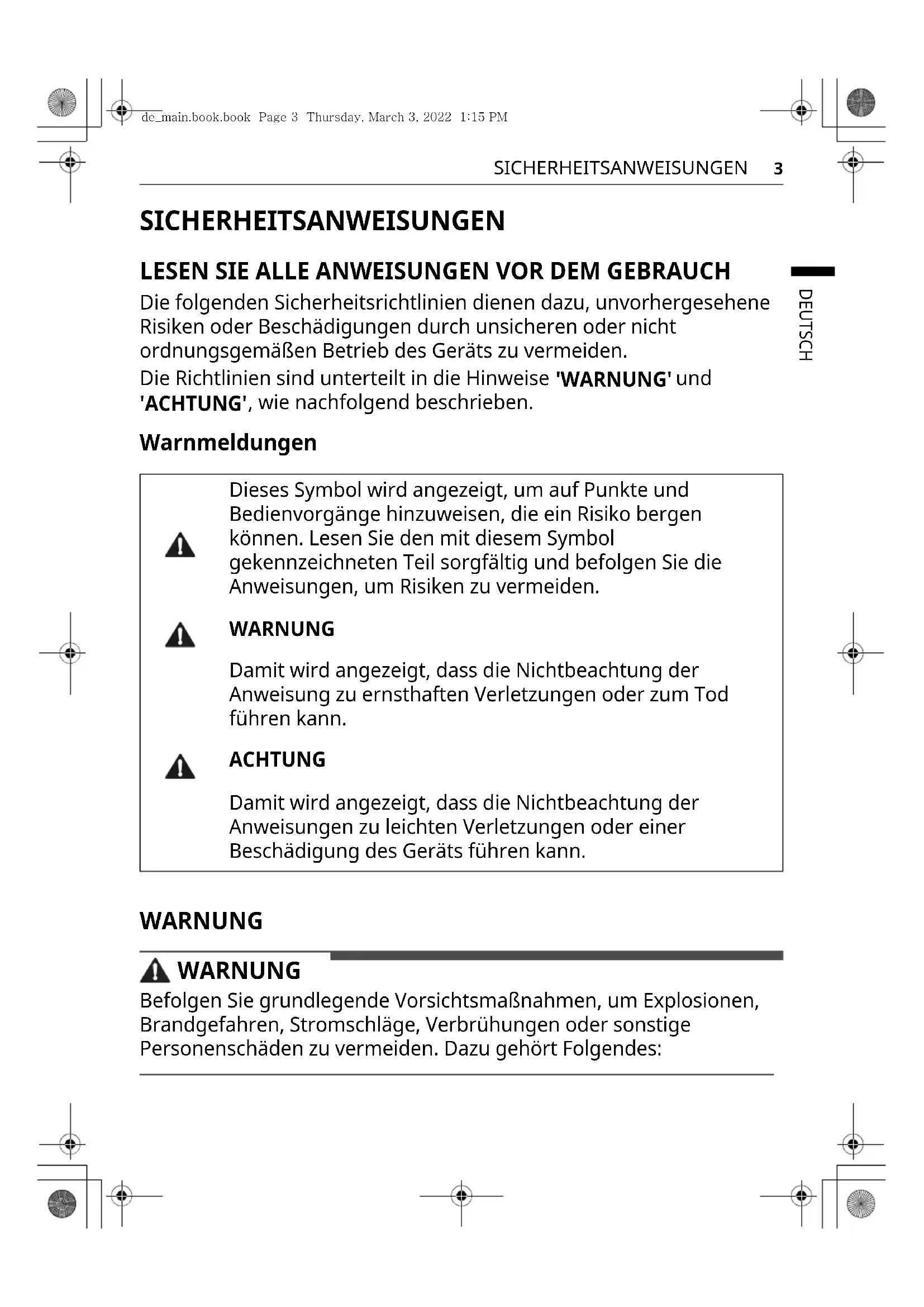 - FEHLERBEHEBUNG Bevor Sie das Servicezentrum anrufen de_main.book.book Page 2 Thursday, March 3, 2022 1:15 PM3 SICHERHEITSANWEISUNGEN DEUTSCH SICHERHEITSANWEISUNGEN LESEN SIE ALLE ANWEISUNGEN VOR DEM GEBRAUCH Die folgenden Sicherheitsrichtlinien dienen dazu, unvorhergesehene Risiken oder Beschädigungen durch unsicheren oder nicht ordnungsgemäßen Betrieb des Geräts zu vermeiden. Die Richtlinien sind unterteilt in die Hinweise 'WARNUNG' und 'ACHTUNG' , wie nachfolgend beschrieben. Warnmeldungen WARNUNG WARNUNG Befolgen Sie grundlegende Vorsichtsmaßnahmen, um Explosionen, Brandgefahren, Stromschläge, Verbrühungen oder sonstige Personenschäden zu vermeiden. Dazu gehört Folgendes: Dieses Symbol wird angezeigt, um auf Punkte und Bedienvorgänge hinzuweisen, die ein Risiko bergen können. Lesen Sie den mit diesem Symbol gekennzeichneten Teil sorgfältig und befolgen Sie die Anweisungen, um Risiken zu vermeiden. WARNUNG Damit wird angezeigt, dass die Nichtbeachtung der Anweisung zu ernsthaften Verletzungen oder zum Tod führen kann. ACHTUNG Damit wird angezeigt, dass die Nichtbeachtung der Anweisungen zu leichten Verletzungen oder einer Beschädigung des Geräts führen kann. de_main.book.book Page 3 Thursday, March 3, 2022 1:15 PM4 SICHERHEITSANWEISUNGEN Technische Sicherheit p. 31
