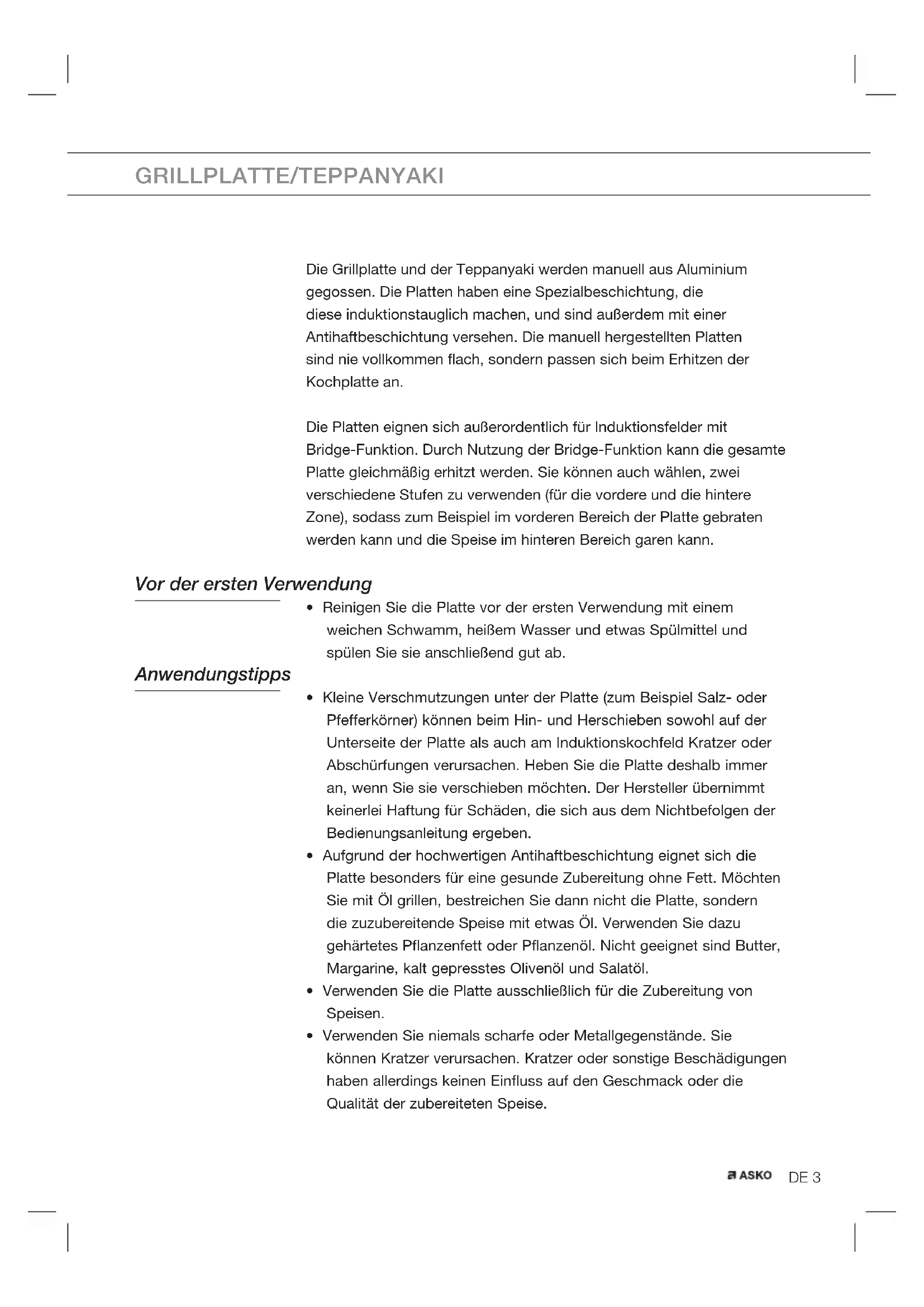 AT12A - Teppanyaki-Platte ASKO - Kostenlose Bedienungsanleitung
