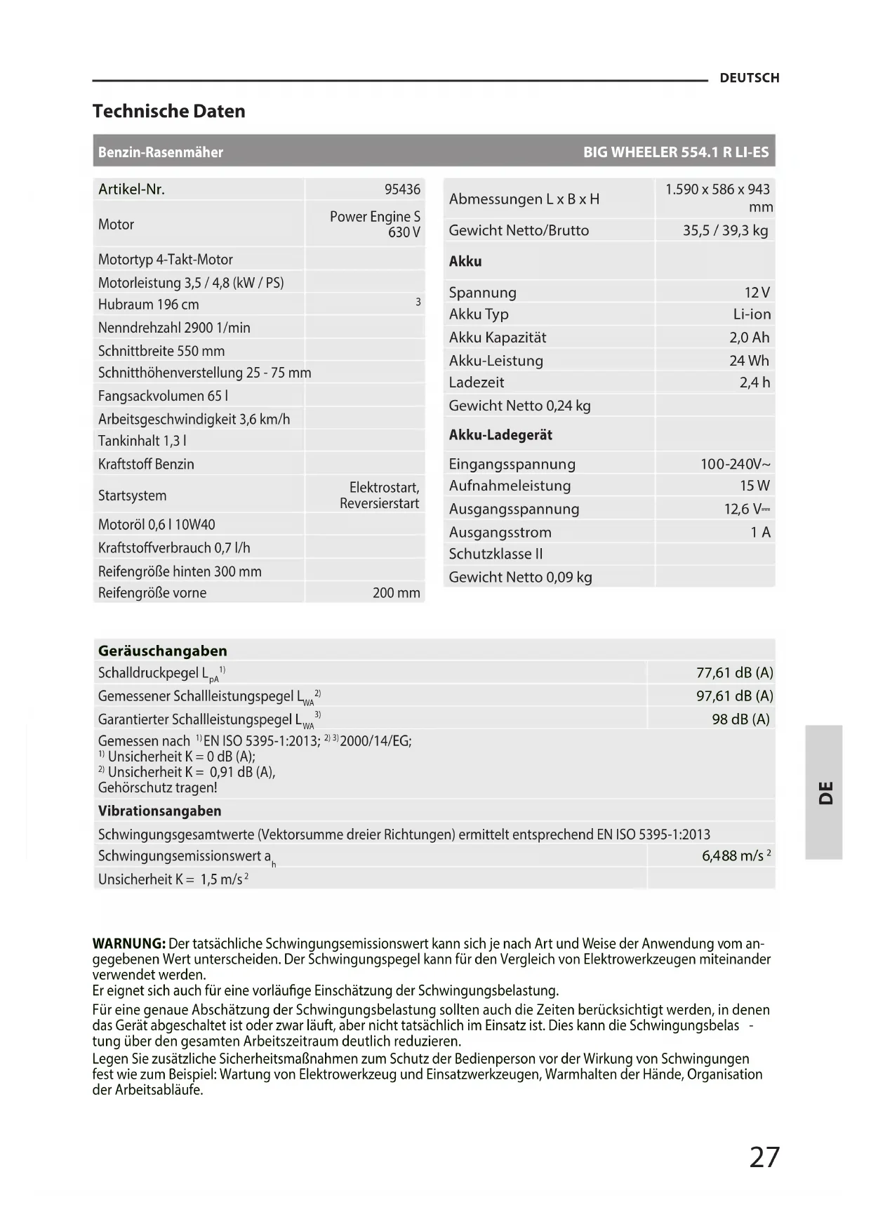 Unsicherheit K = 0,91 dB (A), Gehörschutz tragen! Vibrationsangaben Schwingungsgesamtwerte (Vektorsumme dreier Richtungen) ermittelt entsprechend EN ISO 5395-1:2013 Schwingungsemissionswert a