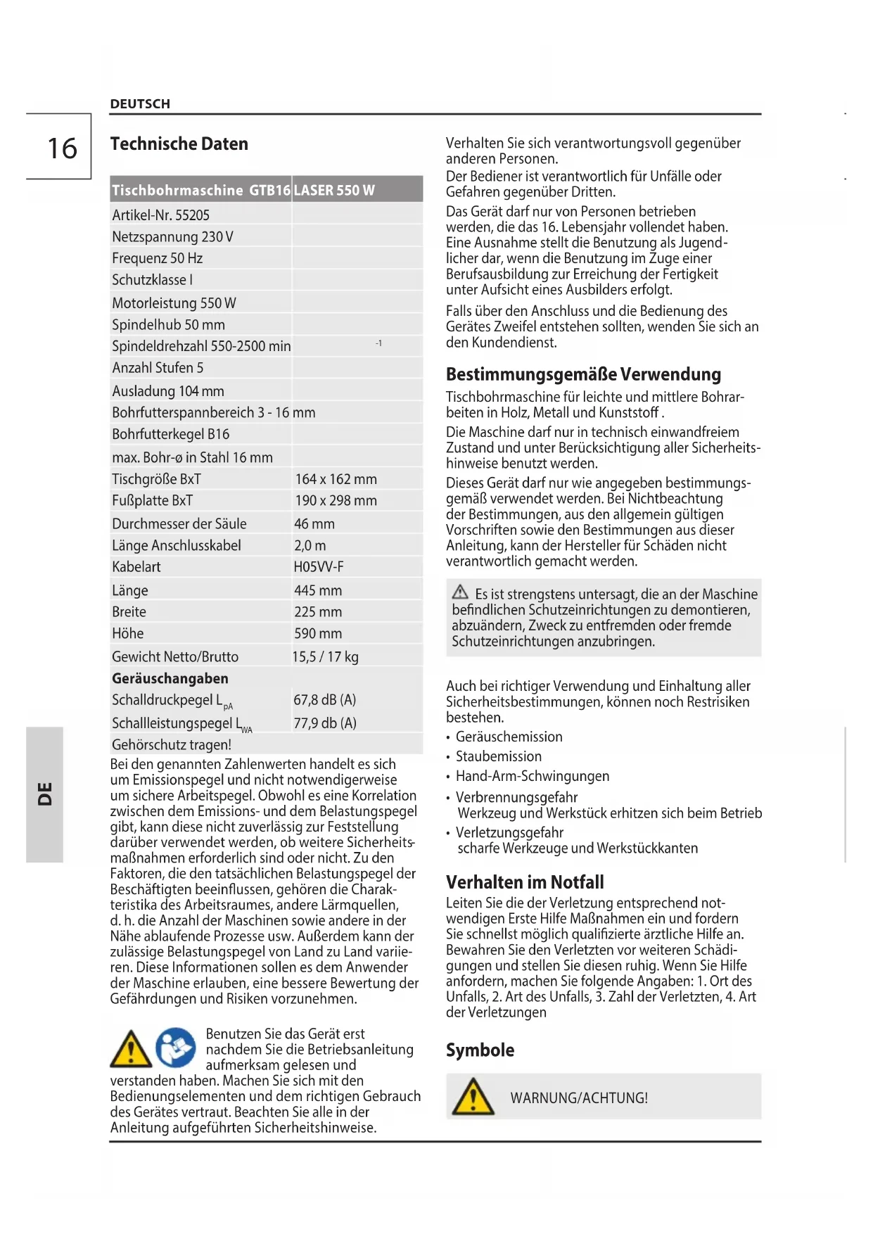 DEUTSCH Technische Daten Tischbohrmaschine GTB16 LASER 550 W Artikel-Nr. 55205 Netzspannung 230 V Frequenz 50 Hz Schutzklasse I Motorleistung 550 W Spindelhub 50 mm Spindeldrehzahl 550-2500 min