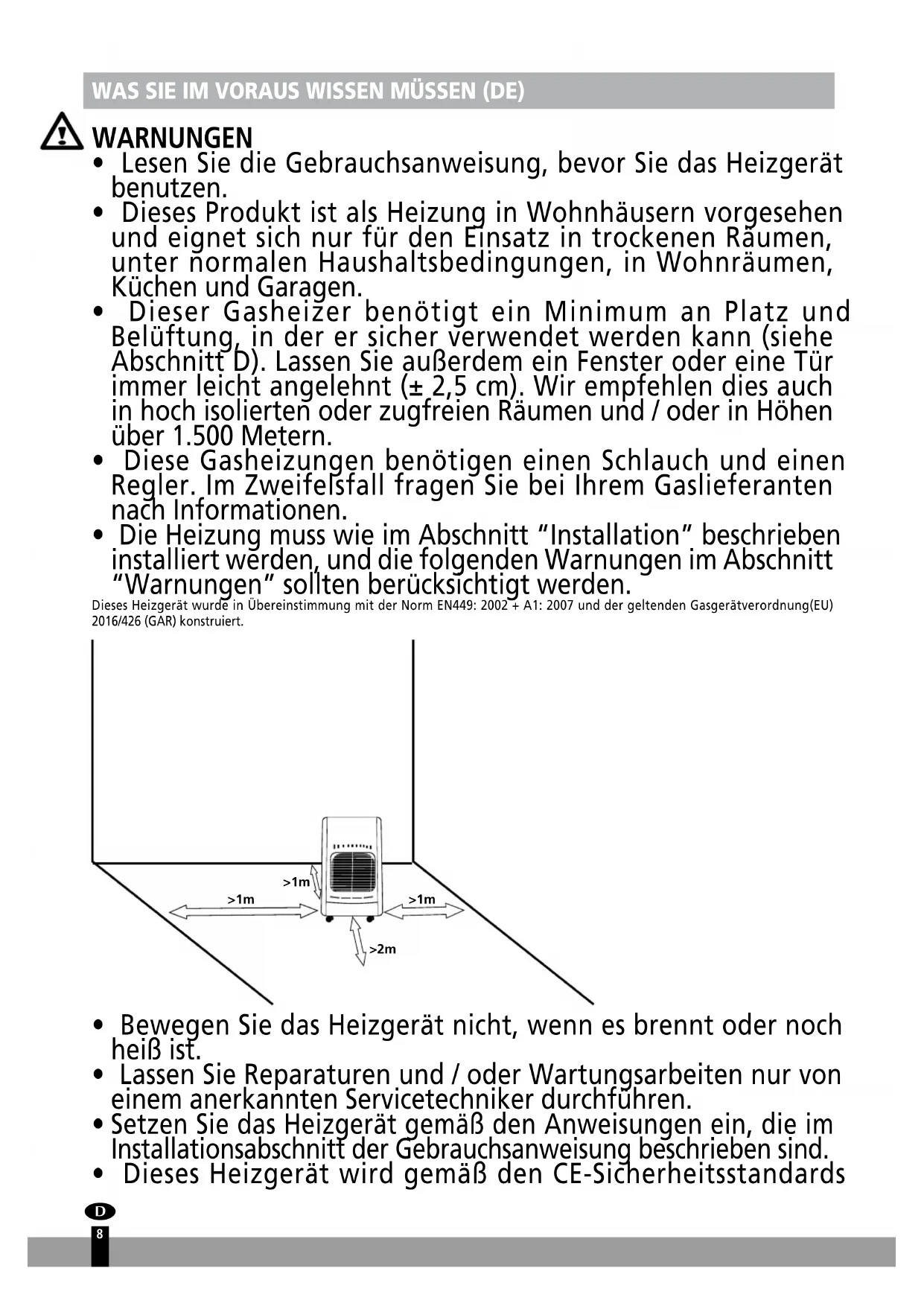 - Dieses Heizgerät wird gemäß den CE-Sicherheitsstandards >1m >1m >2m >1m
