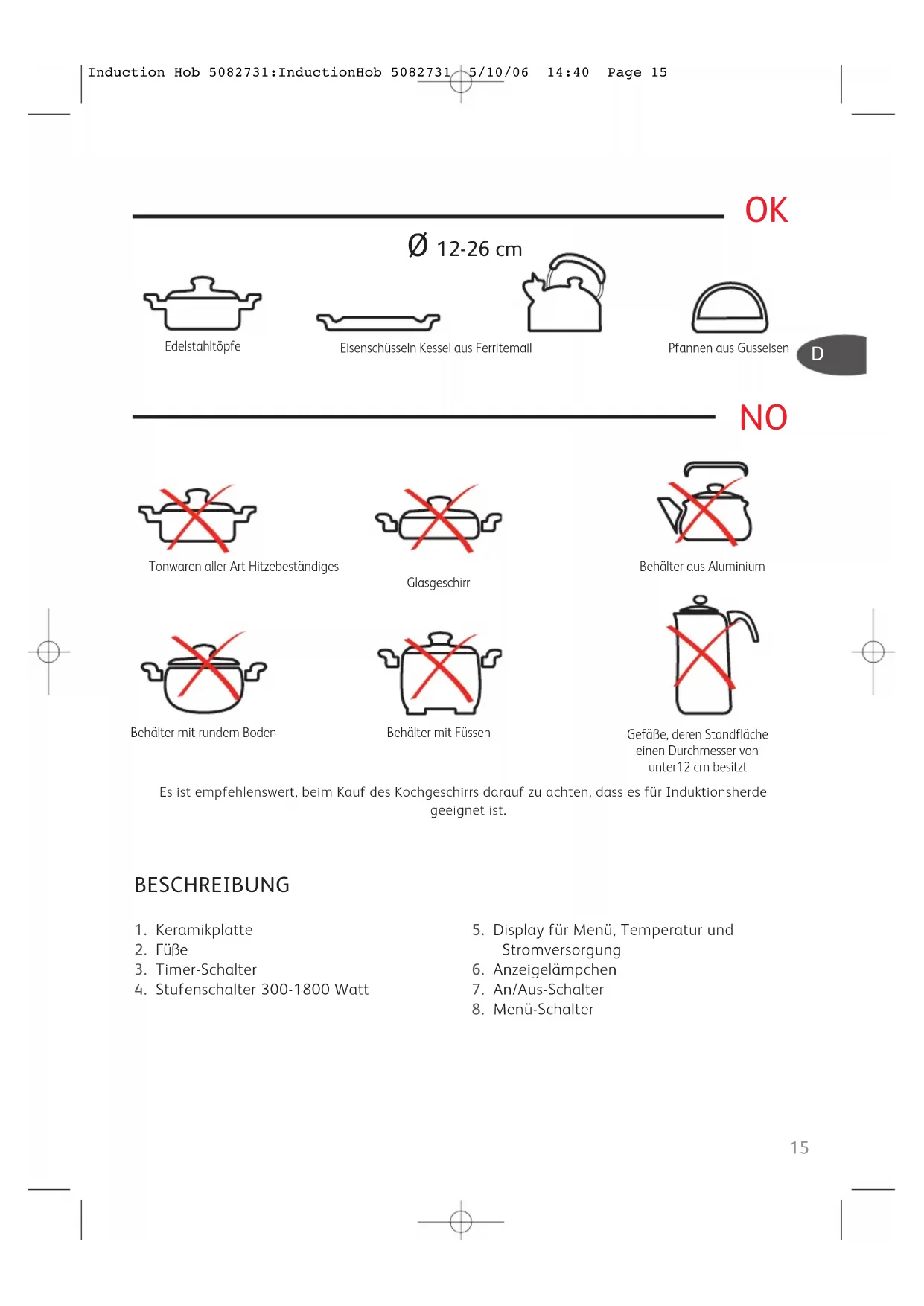 - This product has been designed for domestic use only. Any commercial use, inappropriate use or failure to comply with the instructions, the manufacturer accepts no responsibility and the warranty might not apply. Environment protection first! Your appliance contains valuable materials which can be recovered or recycled. Leave it at a local civic waste collection point. Induction Hob 5082731:InductionHob 5082731 5/10/06 14:40 Page 1415 BESCHREIBUNG EdelstahltöpfeEisenschüsseln Kessel aus FerritemailTonwaren aller Art HitzebeständigesGlasgeschirrBehälter mit rundem BodenGefäße, deren Standflächeeinen Durchmesser vonunter12 cm besitztBehälter mit FüssenBehälter aus Aluminium Pfannen aus GusseisenEs ist empfehlenswert, beim Kauf des Kochgeschirrs darauf zu achten, dass es für Induktionsherdegeeignet ist. Ø 12-26 cm