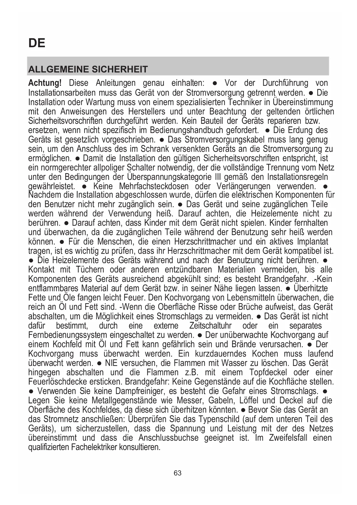 ALLGEMEINE SICHERHEIT Achtung! Diese Anleitungen genau einhalten: Ɣ Vor der Durchführung von Installationsarbeiten muss das Gerät von der Stromversorgung getrennt werden. Ɣ Die Installation oder Wartung muss von einem spezialisierten Techniker in Übereinstimmung mit den Anweisungen des Herstellers und unter Beachtung der geltenden örtlichen Sicherheitsvorschriften durchgeführt werden. Kein Bauteil der Geräts reparieren bzw. ersetzen, wenn nicht spezifisch im Bedienungshandbuch gefordert. Ɣ Die Erdung des Geräts ist gesetzlich vorgeschrieben. Ɣ Das Stromversorgungskabel muss lang genug sein, um den Anschluss des im Schrank versenkten Geräts an die Stromversorgung zu ermöglichen. Ɣ Damit die Installation den gültigen Sicherheitsvorschriften entspricht, ist ein normgerechter allpoliger Schalter notwendig, der die vollständige Trennung vom Netz unter den Bedingungen der Überspannungskategorie III gemäß den Installationsregeln gewährleistet. Ɣ Keine Mehrfachsteckdosen oder Verlängerungen verwenden. Ɣ Nachdem die Installation abgeschlossen wurde, dürfen die elektrischen Komponenten für den Benutzer nicht mehr zugänglich sein. Ɣ Das Gerät und seine zugänglichen Teile werden während der Verwendung heiß. Darauf achten, die Heizelemente nicht zu berühren. Ɣ Darauf achten, dass Kinder mit dem Gerät nicht spielen. Kinder fernhalten und überwachen, da die zugänglichen Teile während der Benutzung sehr heiß werden können. Ɣ Für die Menschen, die einen Herzschrittmacher und ein aktives Implantat tragen, ist es wichtig zu prüfen, dass ihr Herzschrittmacher mit dem Gerät kompatibel ist. Ɣ Die Heizelemente des Geräts während und nach der Benutzung nicht berühren. Ɣ Kontakt mit Tüchern oder anderen entzündbaren Materialien vermeiden, bis alle Komponenten des Geräts ausreichend abgekühlt sind; es besteht Brandgefahr. .-Kein entflammbares Material auf dem Gerät bzw. in seiner Nähe liegen lassen. Ɣ Überhitzte Fette und Öle fangen leicht Feuer. Den Kochvorgang von Lebensmitteln überwachen, die reich an Öl und Fett sind. -Wenn die Oberfläche Risse oder Brüche aufweist, das Gerät abschalten, um die Möglichkeit eines Stromschlags zu vermeiden. Ɣ Das Gerät ist nicht dafür bestimmt, durch eine externe Zeitschaltuhr oder ein separates Fernbedienungssystem eingeschaltet zu werden. Ɣ Der unüberwachte Kochvorgang auf einem Kochfeld mit Öl und Fett kann gefährlich sein und Brände verursachen. Ɣ Der Kochvorgang muss überwacht werden. Ein kurzdauerndes Kochen muss laufend überwacht werden. Ɣ NIE versuchen, die Flammen mit Wasser zu löschen. Das Gerät hingegen abschalten und die Flammen z.B. mit einem Topfdeckel oder einer Feuerlöschdecke ersticken. Brandgefahr: Keine Gegenstände auf die Kochfläche stellen. Ɣ Verwenden Sie keine Dampfreiniger, es besteht die Gefahr eines Stromschlags. Ɣ Legen Sie keine Metallgegenstände wie Messer, Gabeln, Löffel und Deckel auf die Oberfläche des Kochfeldes, da diese sich überhitzen könnten. Ɣ Bevor Sie das Gerät an das Stromnetz anschließen: Überprüfen Sie das Typenschild (auf dem unteren Teil des Geräts), um sicherzustellen, dass die Spannung und Leistung mit der des Netzes übereinstimmt und dass die Anschlussbuchse geeignet ist. Im Zweifelsfall einen qualifizierten Fachelektriker konsultieren.64 Wichtig: Ɣ Das Kochfeld nach der Benutzung mit seiner Steuervorrichtung abschalten und sich nie auf dem Topffühler verlassen. Ɣ Die Austritte von Flüssigkeiten vermeiden. Daher soll die Wärmeerzeugung zum Kochen oder Aufwärmen von Flüssigkeiten abgesenkt werden. Ɣ Die Heizelemente mit leeren Töpfen und Pfannen oder ohne Behälter nie eingeschaltet lassen. Ɣ Wenn Sie mit dem Kochen fertig sind, schalten Sie die entsprechende Kochzone aus. Ɣ Verwenden Sie niemals Alufolie zum Kochen und legen Sie niemals aluminiumverpackte Produkte direkt auf. Das Aluminium würde schmelzen und daher Ihr Gerät unwiderruflich beschädigen. Ɣ Niemals eine KonservenƔ oder Blechdose erhitzen, ohne sie vorher geöffnet zu haben: Sie könnte explodieren! Diese Warnung gilt für alle anderen Sorten von Kochfeldern. Ɣ Die Benutzung einer hohen Leistung wie die Booster-Funktion eignet sich nicht zum Aufwärmen von einigen Flüssigkeiten, wie z.B. das Bratöl. Überhöhte Wärme könnte gefährlich sein. In diesen Fällen wird die Benutzung einer niedrigeren Leistung empfohlen. Ɣ Die Behälter müssen direkt auf das Kochfeld gestellt werden und zentriert sein. Auf keinen Fall dürfen andere Gegenstände zwischen Herd und Kochfeld eingesetzt werden. Ɣ Bei hohen Temperaturen senkt das Gerät die Leistungsstufe der Kochbereiche automatisch ab. Ɣ Vor jeglichem ReinigungsƔ oder Wartungseingriff das Gerät von der Stromversorgung durch Ausstecken des Steckers oder durch Abschalten des Hauptschalters der Wohnung trennen. Ɣ Bei allen Vorgängen der Installation und Wartung Arbeitshandschuhe verwenden. Ɣ Das Gerät darf von Kindern ab dem Alter von 8 Jahren und von Personen mit eingeschränkten körperlichen, sensorischen oder geistigen Fähigkeiten oder ohne Erfahrung oder notwendige Kenntnisse benutzt werden, wenn sie beaufsichtigt werden oder vorher Anweisungen zur sicheren Verwendung des Geräts und zum Verständnis der damit verbundenen Gefahren erhalten haben. Ɣ Kinder müssen beaufsichtigt werden, um sicherzustellen, dass sie nicht mit dem Gerät spielen. Ɣ Die Reinigung und Wartung darf nicht von Kindern ohne Aufsicht ausgeführt werden. Ɣ Wenn das Gerät zusammen mit anderen Geräten mit Gasverbrennung oder anderen Brennstoffen verwendet wird, muss für eine ausreichende Belüftung des Raums gesorgt werden. Ɣ Das Gerät muss regelmäßig (MINDESTENS EINMAL PRO MONAT) innen und außen gereinigt werden; die Wartungsanweisungen müssen trotzdem beachtet werden. Ɣ Die Nichteinhaltung der Reinigungsrichtlinien des Gerätes und des Austauschs und der Reinigung der Filter führt zu einem Brandrisiko. Ɣ Flammbiere