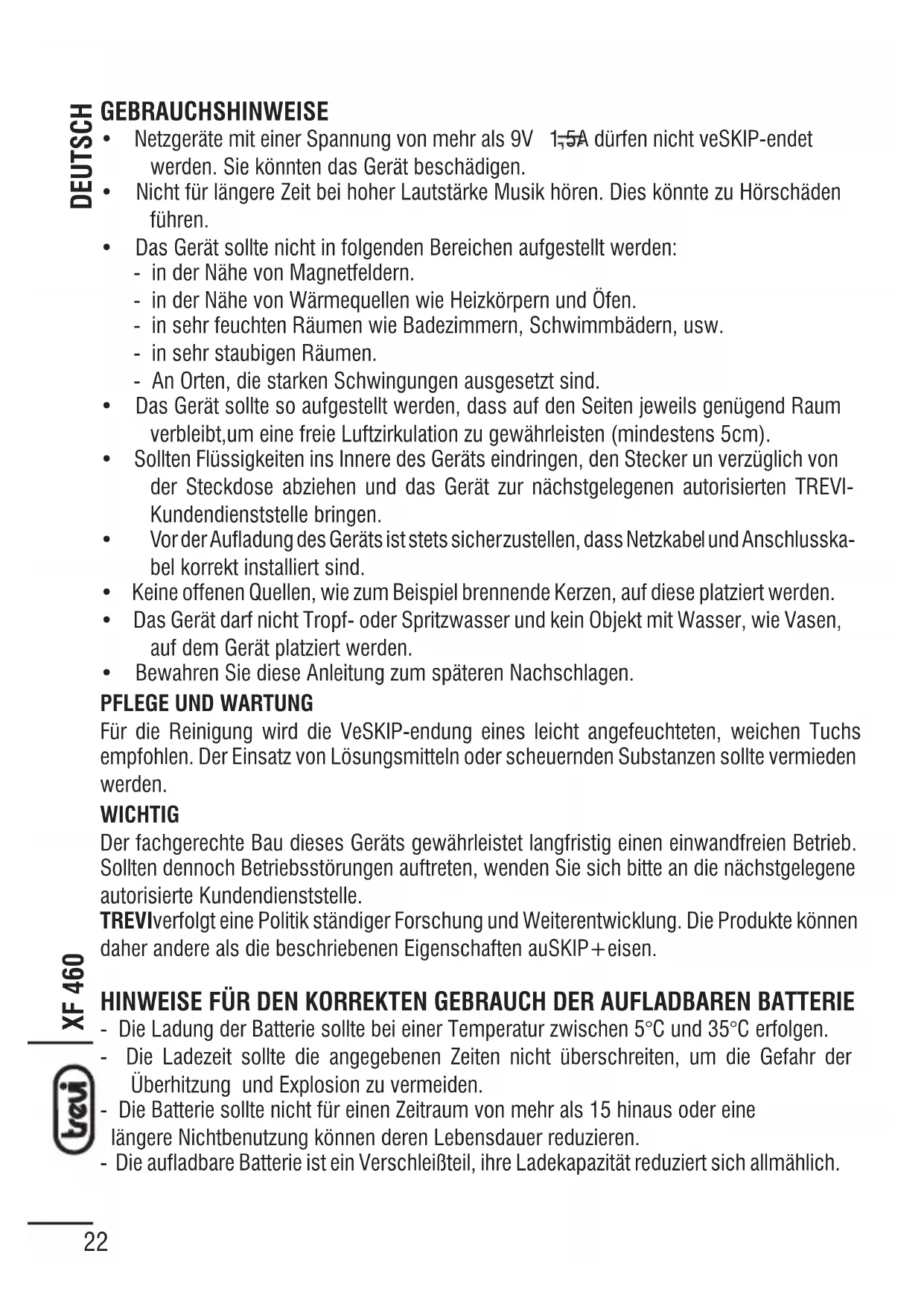Für die Reinigung wird die VeSKIP-endung eines leicht angefeuchteten, weichen Tuchs empfohlen. Der Einsatz von Lösungsmitteln oder scheuernden Substanzen sollte vermieden werden. WICHTIG Der fachgerechte Bau dieses Geräts gewährleistet langfristig einen einwandfreien Betrieb. Sollten dennoch Betriebsstörungen auftreten, wenden Sie sich bitte an die nächstgelegene autorisierte Kundendienststelle. TREVIverfolgt eine Politik ständiger Forschung und Weiterentwicklung. Die Produkte können daher andere als die beschriebenen Eigenschaften auSKIP+eisen. HINWEISE FÜR DEN KORREKTEN GEBRAUCH DER AUFLADBAREN BATTERIE - Die Ladung der Batterie sollte bei einer Temperatur zwischen 5°C und 35°C erfolgen. - Die Ladezeit sollte die angegebenen Zeiten nicht überschreiten, um die Gefahr der Überhitzung und Explosion zu vermeiden. - Die Batterie sollte nicht für einen Zeitraum von mehr als 15 hinaus oder eine längere Nichtbenutzung können deren Lebensdauer reduzieren. - Die aufladbare Batterie ist ein Verschleißteil, ihre Ladekapazität reduziert sich allmählich. DEUTSCHXF 460