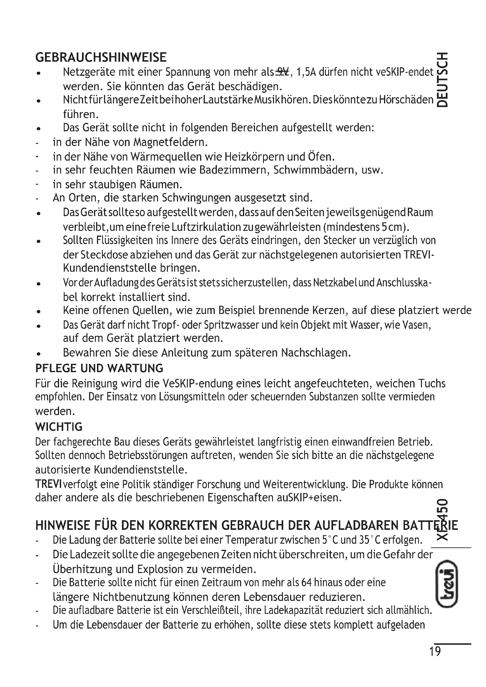 Für die Reinigung wird die VeSKIP-endung eines leicht angefeuchteten, weichen Tuchs empfohlen. Der Einsatz von Lösungsmitteln oder scheuernden Substanzen sollte vermieden werden. WICHTIG Der fachgerechte Bau dieses Geräts gewährleistet langfristig einen einwandfreien Betrieb. Sollten dennoch Betriebsstörungen auftreten, wenden Sie sich bitte an die nächstgelegene autorisierte Kundendienststelle. TREVI verfolgt eine Politik ständiger Forschung und Weiterentwicklung. Die Produkte können daher andere als die beschriebenen Eigenschaften auSKIP+eisen.