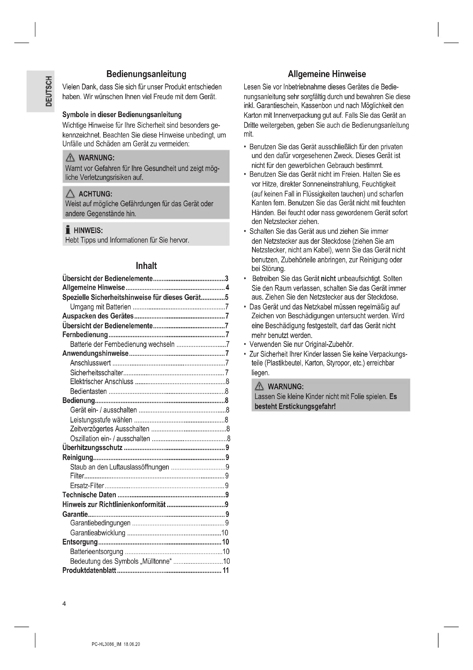 - Zur Sicherheit Ihrer Kinder lassen Sie keine Verpackungs- teile (Plastikbeutel, Karton, Styropor, etc.) erreichbar liegen. WARNUNG: Lassen Sie kleine Kinder nicht mit Folie spielen. Es besteht Erstickungsgefahr!5 PC-HL3086_IM 18.06.20 Spezielle Sicherheitshinweise für dieses Gerät Auf dem Produkt nden Sie folgendes Symbol mit Warncharakter: WARNUNG: Um eine Überhitzung des Heizgerätes zu vermeiden, darf das Heizgerät nicht abgedeckt werden. WARNUNG:
