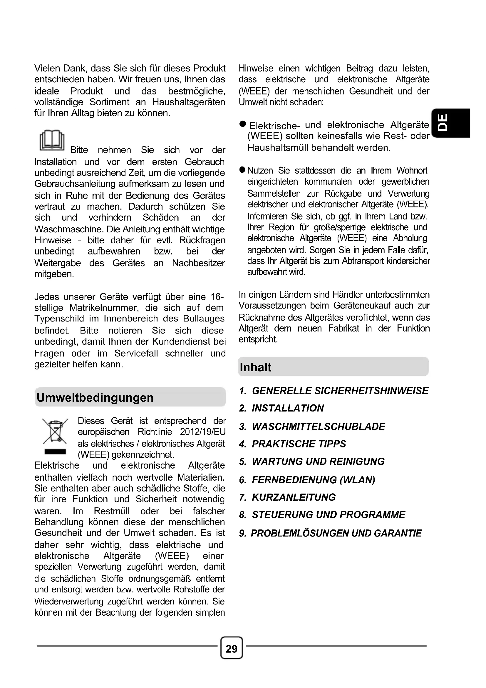 Bitte nehmen Sie sich vor der Installation und vor dem ersten Gebrauch unbedingt ausreichend Zeit, um die vorliegende Gebrauchsanleitung aufmerksam zu lesen und sich in Ruhe mit der Bedienung des Gerätes vertraut zu machen. Dadurch schützen Sie sich und verhindern Schäden an der Waschmaschine. Die Anleitung enthält wichtige Hinweise