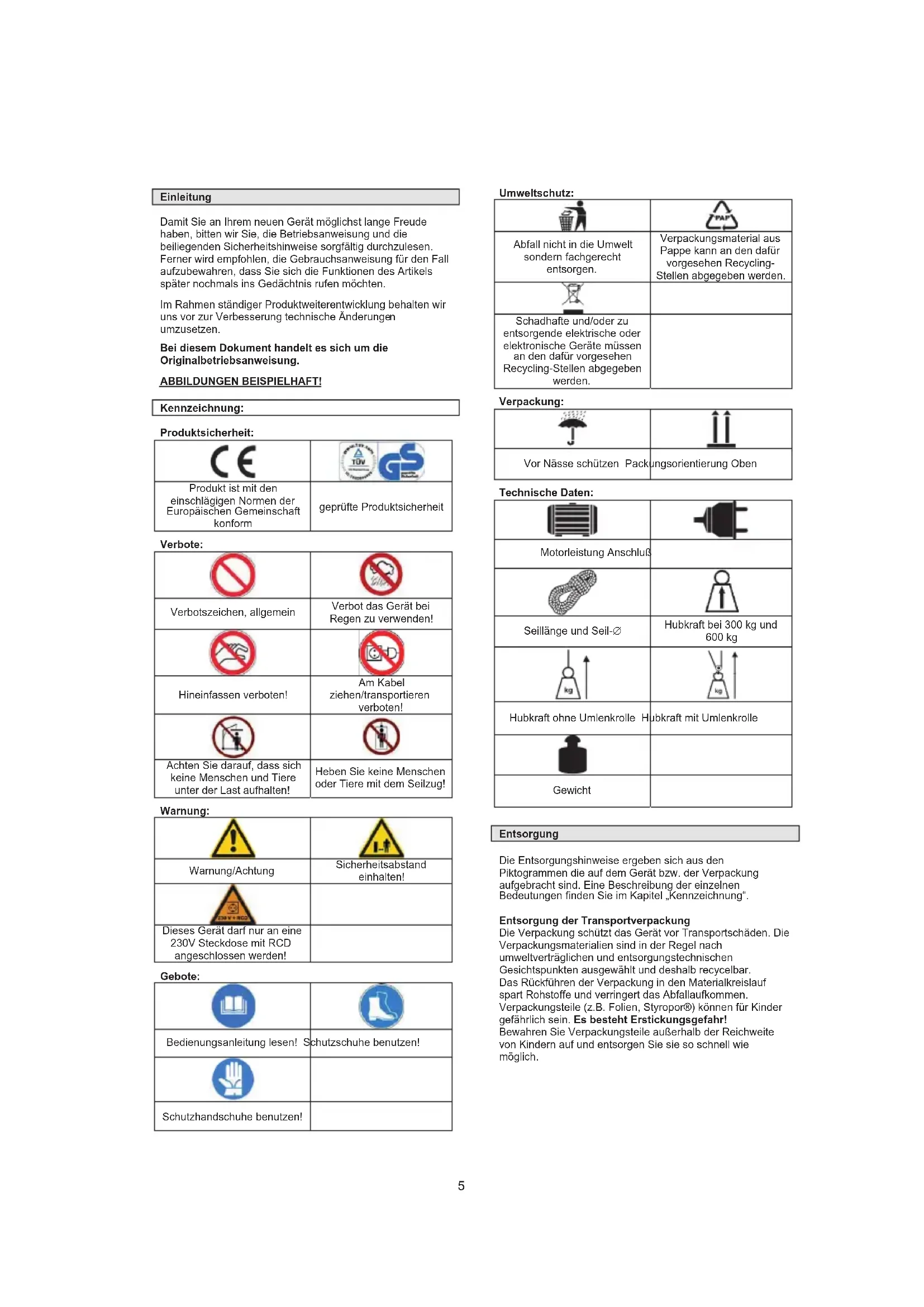 umzusetzen. Bei diesem Dokument handelt es sich um die Originalbetriebsanweisung. ABBILDUNGEN BEISPIELHAFT! Kennzeichnung: Produktsicherheit: Produkt ist mit den einschlägigen Normen der Europäischen Gemeinschaft konform geprüfte Produktsicherheit Verbote: Verbotszeichen, allgemein Verbot das Gerät bei Regen zu verwenden! Hineinfassen verboten! Am Kabel ziehen/transportieren verboten! Achten Sie darauf, dass sich keine Menschen und Tiere unter der Last aufhalten! Heben Sie keine Menschen oder Tiere mit dem Seilzug! Warnung: Warnung/Achtung Sicherheitsabstand einhalten! Dieses Gerät darf nur an eine 230V Steckdose mit RCD angeschlossen werden! Gebote: Bedienungsanleitung lesen! Schutzschuhe benutzen! Schutzhandschuhe benutzen! Umweltschutz: Abfall nicht in die Umwelt sondern fachgerecht entsorgen. Verpackungsmaterial aus Pappe kann an den dafür vorgesehen Recycling- Stellen abgegeben werden. Schadhafte und/oder zu entsorgende elektrische oder elektronische Geräte müssen an den dafür vorgesehen Recycling-Stellen abgegeben werden. Verpackung: Vor Nässe schützen Packungsorientierung Oben Technische Daten: Motorleistung Anschluß Seillänge und Seil- Hubkraft bei 300 kg und 600 kg Hubkraft ohne Umlenkrolle Hubkraft mit Umlenkrolle Gewicht Entsorgung Die Entsorgungshinweise ergeben sich aus den Piktogrammen die auf dem Gerät bzw. der Verpackung aufgebracht sind. Eine Beschreibung der einzelnen Bedeutungen finden Sie im Kapitel „Kennzeichnung“. Entsorgung der Transportverpackung Die Verpackung schützt das Gerät vor Transportschäden. Die Verpackungsmaterialien sind in der Regel nach umweltverträglichen und entsorgungstechnischen Gesichtspunkten ausgewählt und deshalb recycelbar. Das Rückführen der Verpackung in den Materialkreislauf spart Rohstoffe und verringert das Abfallaufkommen. Verpackungsteile (z.B. Folien, Styropor®) können für Kinder gefährlich sein. Es besteht Erstickungsgefahr! Bewahren Sie Verpackungsteile außerhalb der Reichweite von Kindern auf und entsorgen Sie sie so schnell wie möglich. 5Bestimmungsgemäße Verwendung Elektrischer Seilzug GSZ 300/600 Der nachstehend beschriebene Seilzug wurde ausschließlich