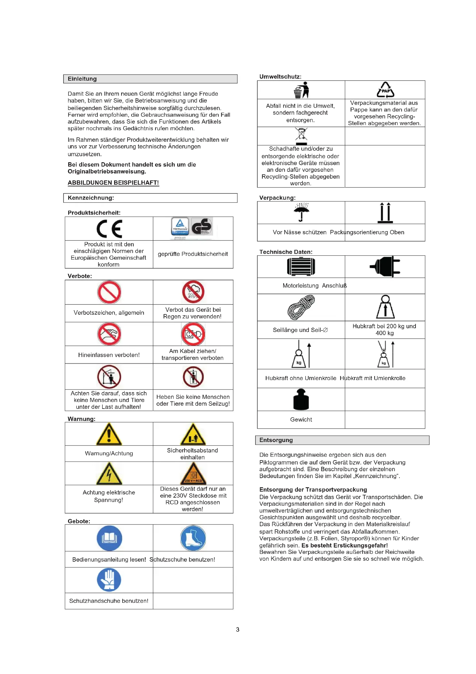 nnzeichnung: Produktsicherheit: Produkt ist mit den einschlägigen Normen der Europäischen Gemeinschaft konform geprüfte Produktsicherheit Verbote: Verbotszeichen, allgemein Verbot das Gerät bei Regen zu verwenden! Hineinfassen verboten! Am Kabel ziehen/ transportieren verboten Achten Sie darauf, dass sich keine Menschen und Tiere unter der Last aufhalten! Heben Sie keine Menschen oder Tiere mit dem Seilzug! Warnung: Warnung/Achtung Sicherheitsabstand einhalten Achtung elektrische Spannung! Dieses Gerät darf nur an eine 230V Steckdose mit RCD angeschlossen werden! Gebote: Bedienungsanleitung lesen! Schutzschuhe benutzen! Schutzhandschuhe benutzen!