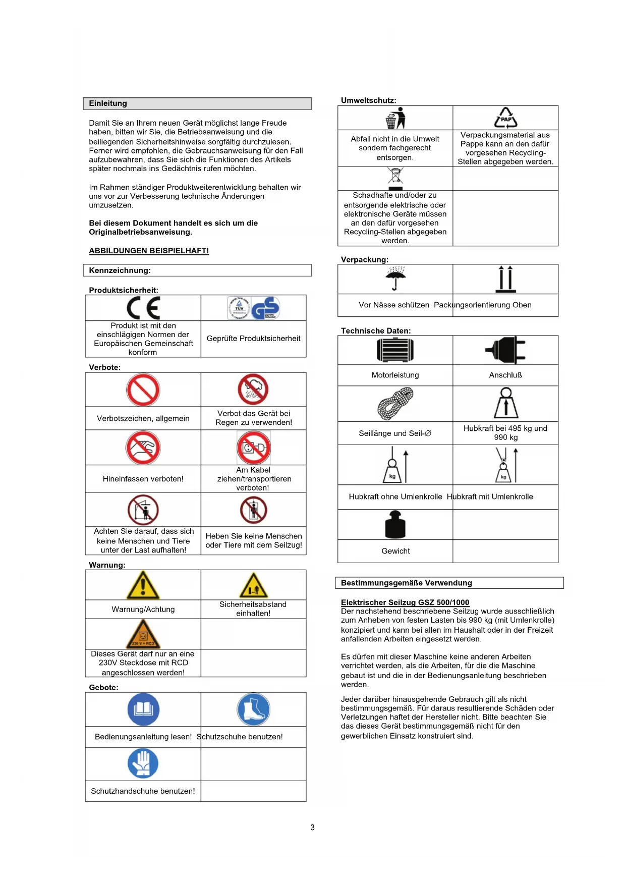 Gewicht Bestimmungsgemäße Verwendung Elektrischer Seilzug GSZ 500/1000 Der nachstehend beschriebene Seilzug wurde ausschließlich zum Anheben von festen Lasten bis 990 kg (mit Umlenkrolle) konzipiert und kann bei allen im Haushalt oder in der Freizeit anfallenden Arbeiten eingesetzt werden. Es dürfen mit dieser Maschine keine anderen Arbeiten verrichtet werden, als die Arbeiten, für die die Maschine gebaut ist und die in der Bedienungsanleitung beschrieben werden. Jeder darüber hinausgehende Gebrauch gilt als nicht bestimmungsgemäß. Für daraus resultierende Schäden oder Verletzungen haftet der Hersteller nicht. Bitte beachten Sie das dieses Gerät bestimmungsgemäß nicht für den gewerblichen Einsatz konstruiert sind.