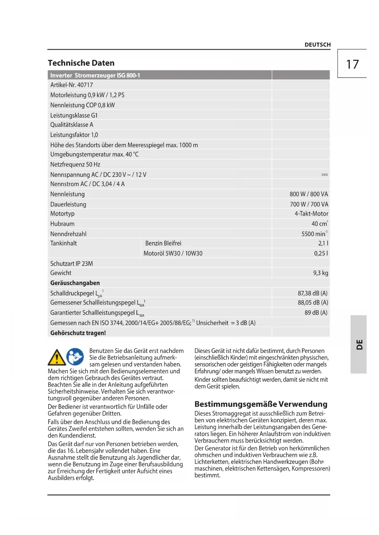 Technische Daten Inverter Stromerzeuger ISG 800-1 Artikel-Nr. 40717 Motorleistung 0,9 kW / 1,2 PS Nennleistung COP 0,8 kW Leistungsklasse G1 Qualitätsklasse A Leistungsfaktor 1,0 Höhe des Standorts über dem Meeresspiegel max. 1000 m Umgebungstemperatur max. 40 °C Netzfrequenz 50 Hz Nennspannung AC / DC 230 V ~ / 12 V Nennstrom AC / DC 3,04 / 4 A Nennleistung 800 W / 800 VA Dauerleistung 700 W / 700 VA Motortyp 4-Takt-Motor Hubraum 40 cm