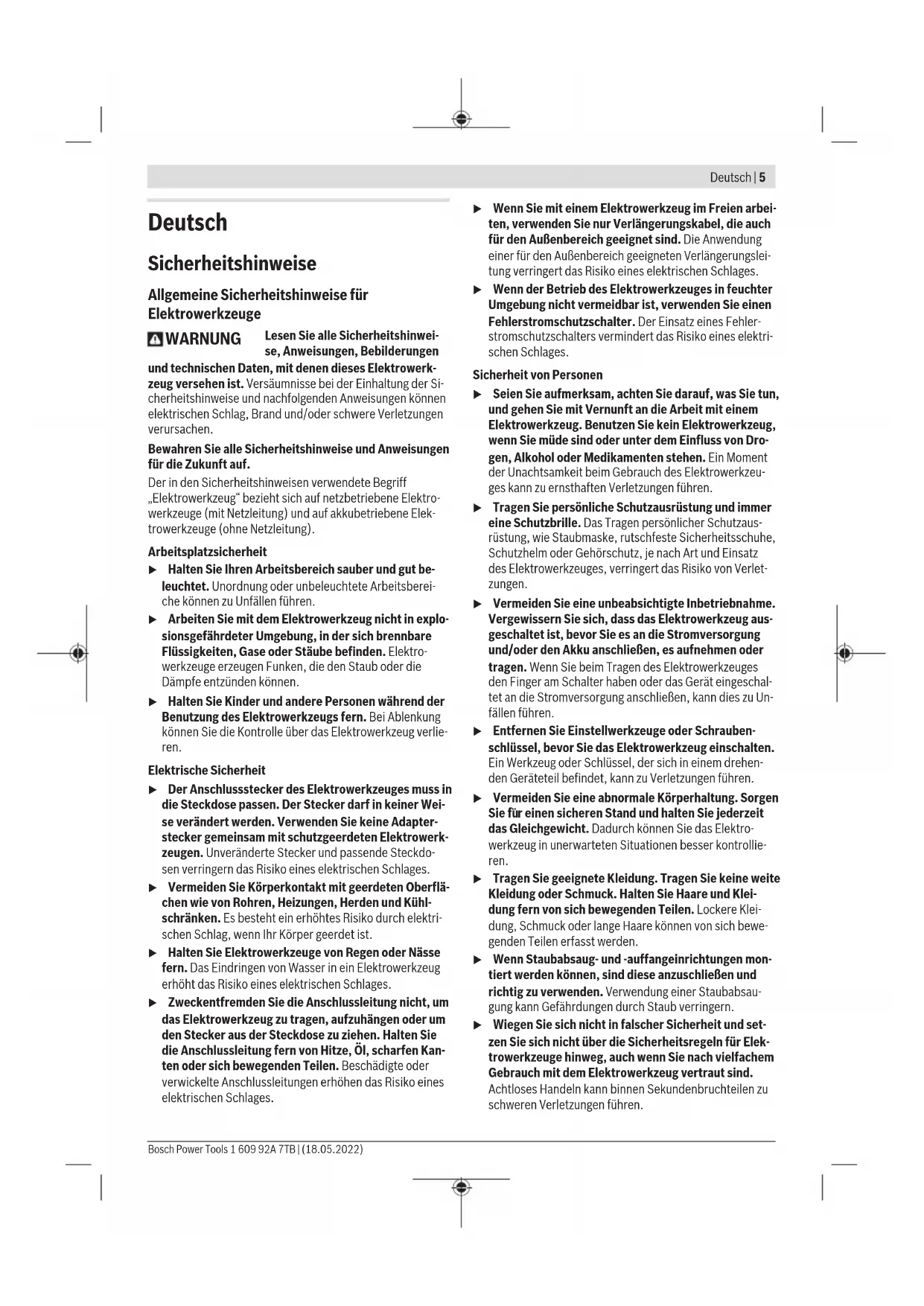 (32) (4) 1 609 92A 7TB | (18.05.2022) Bosch Power ToolsDeutsch | 5 Deutsch Sicherheitshinweise Allgemeine Sicherheitshinweise für Elektrowerkzeuge WARNUNG Lesen Sie alle Sicherheitshinwei- se, Anweisungen, Bebilderungen und technischen Daten, mit denen dieses Elektrowerk- zeug versehen ist. Versäumnisse bei der Einhaltung der Si- cherheitshinweise und nachfolgenden Anweisungen können elektrischen Schlag, Brand und/oder schwere Verletzungen verursachen. Bewahren Sie alle Sicherheitshinweise und Anweisungen für die Zukunft auf. Der in den Sicherheitshinweisen verwendete Begriff „Elektrowerkzeug“ bezieht sich auf netzbetriebene Elektro- werkzeuge (mit Netzleitung) und auf akkubetriebene Elek- trowerkzeuge (ohne Netzleitung). Arbeitsplatzsicherheit u Halten Sie Ihren Arbeitsbereich sauber und gut be- leuchtet. Unordnung oder unbeleuchtete Arbeitsberei- che können zu Unfällen führen. u Arbeiten Sie mit dem Elektrowerkzeug nicht in explo- sionsgefährdeter Umgebung, in der sich brennbare Flüssigkeiten, Gase oder Stäube befinden. Elektro- werkzeuge erzeugen Funken, die den Staub oder die Dämpfe entzünden können. u Halten Sie Kinder und andere Personen während der Benutzung des Elektrowerkzeugs fern. Bei Ablenkung können Sie die Kontrolle über das Elektrowerkzeug verlie- ren. Elektrische Sicherheit u Der Anschlussstecker des Elektrowerkzeuges muss in die Steckdose passen. Der Stecker darf in keiner Wei- se verändert werden. Verwenden Sie keine Adapter- stecker gemeinsam mit schutzgeerdeten Elektrowerk- zeugen. Unveränderte Stecker und passende Steckdo- sen verringern das Risiko eines elektrischen Schlages. u Vermeiden Sie Körperkontakt mit geerdeten Oberflä- chen wie von Rohren, Heizungen, Herden und Kühl- schränken. Es besteht ein erhöhtes Risiko durch elektri- schen Schlag, wenn Ihr Körper geerdet ist. u Halten Sie Elektrowerkzeuge von Regen oder Nässe fern. Das Eindringen von Wasser in ein Elektrowerkzeug erhöht das Risiko eines elektrischen Schlages. u Zweckentfremden Sie die Anschlussleitung nicht, um das Elektrowerkzeug zu tragen, aufzuhängen oder um den Stecker aus der Steckdose zu ziehen. Halten Sie die Anschlussleitung fern von Hitze, Öl, scharfen Kan- ten oder sich bewegenden Teilen. Beschädigte oder verwickelte Anschlussleitungen erhöhen das Risiko eines elektrischen Schlages. u Wenn Sie mit einem Elektrowerkzeug im Freien arbei- ten, verwenden Sie nur Verlängerungskabel, die auch für den Außenbereich geeignet sind. Die Anwendung einer für den Außenbereich geeigneten Verlängerungslei- tung verringert das Risiko eines elektrischen Schlages. u Wenn der Betrieb des Elektrowerkzeuges in feuchter Umgebung nicht vermeidbar ist, verwenden Sie einen Fehlerstromschutzschalter. Der Einsatz eines Fehler- stromschutzschalters vermindert das Risiko eines elektri- schen Schlages. Sicherheit von Personen u Seien Sie aufmerksam, achten Sie darauf, was Sie tun, und gehen Sie mit Vernunft an die Arbeit mit einem Elektrowerkzeug. Benutzen Sie kein Elektrowerkzeug, wenn Sie müde sind oder unter dem Einfluss von Dro- gen, Alkohol oder Medikamenten stehen. Ein Moment der Unachtsamkeit beim Gebrauch des Elektrowerkzeu- ges kann zu ernsthaften Verletzungen führen. u Tragen Sie persönliche Schutzausrüstung und immer eine Schutzbrille. Das Tragen persönlicher Schutzaus- rüstung, wie Staubmaske, rutschfeste Sicherheitsschuhe, Schutzhelm oder Gehörschutz, je nach Art und Einsatz des Elektrowerkzeuges, verringert das Risiko von Verlet- zungen. u Vermeiden Sie eine unbeabsichtigte Inbetriebnahme. Vergewissern Sie sich, dass das Elektrowerkzeug aus- geschaltet ist, bevor Sie es an die Stromversorgung und/oder den Akku anschließen, es aufnehmen oder tragen. Wenn Sie beim Tragen des Elektrowerkzeuges den Finger am Schalter haben oder das Gerät eingeschal- tet an die Stromversorgung anschließen, kann dies zu Un- fällen führen. u Entfernen Sie Einstellwerkzeuge oder Schrauben- schlüssel, bevor Sie das Elektrowerkzeug einschalten. Ein Werkzeug oder Schlüssel, der sich in einem drehen- den Geräteteil befindet, kann zu Verletzungen führen. u Vermeiden Sie eine abnormale Körperhaltung. Sorgen Sie fu