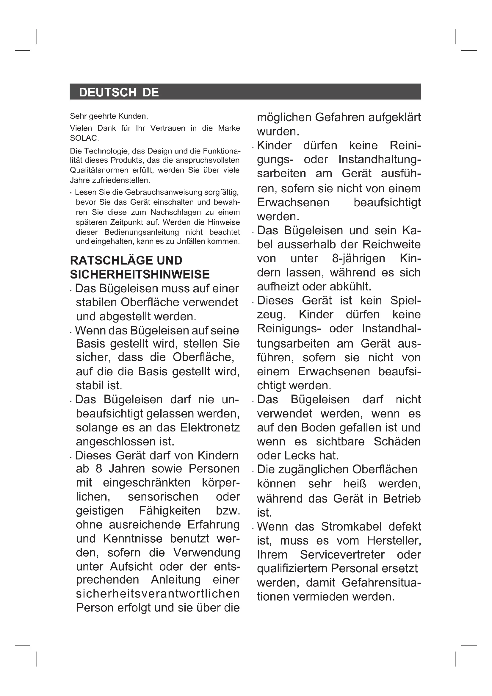 CHER SERVICE Dieses Produkt ist von der gesetzlichen Garan- tie gemäss der geltenden Gesetzgebung ges- chützt. Um Ihre Rechte und Interessen geltend zu machen, müssen Sie eines unserer ofziellen Servicezentren aufsuchen. Über folgenden Link nden Sie ein Servicezen- trum in Ihrer Nähe: http://solac.com Sie können auch Informationen anfordern, in- dem Sie sich mit uns in Verbindung setzen. Sie können dieses Benutzerhandbuch und seine Aktualisierungen unter http://solac.com