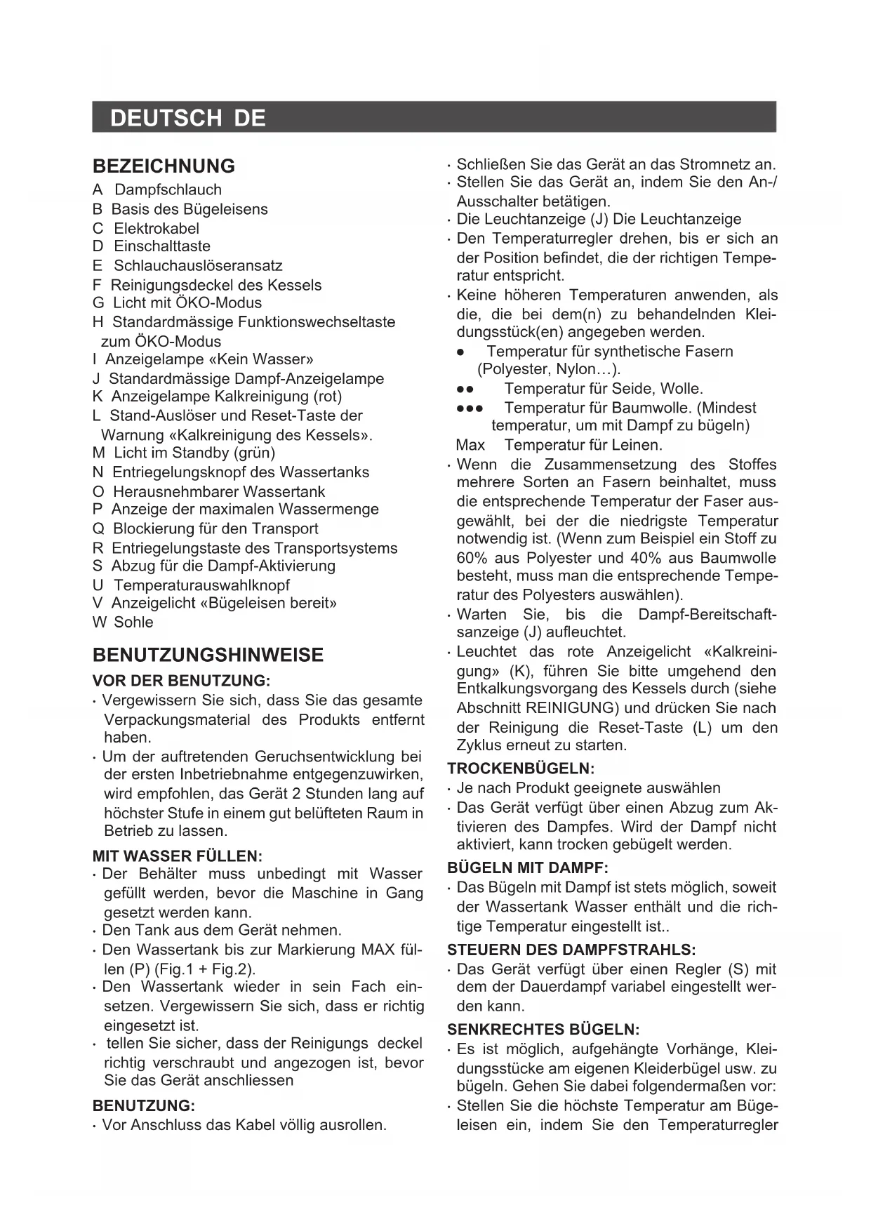 - En cas de panne, remettre l’appareil à un ser- vice d’assistance technique autorisé. Ne pas tenter de procéder aux réparations ou de dé- monter l’appareil; cela implique des risques. FRDEUTSCH DE BEZEICHNUNG A Dampfschlauch B Basis des Bügeleisens C Elektrokabel D Einschalttaste E Schlauchauslöseransatz F Reinigungsdeckel des Kessels G Licht mit ÖKO-Modus H Standardmässige Funktionswechseltaste zum ÖKO-Modus I Anzeigelampe «Kein Wasser» J Standardmässige Dampf-Anzeigelampe K Anzeigelampe Kalkreinigung (rot) L Stand-Auslöser und Reset-Taste der Warnung «Kalkreinigung des Kessels». M Licht im Standby (grün) N Entriegelungsknopf des Wassertanks O Herausnehmbarer Wassertank P Anzeige der maximalen Wassermenge Q Blockierung für den Transport R Entriegelungstaste des Transportsystems S Abzug für die Dampf-Aktivierung U Temperaturauswahlknopf V Anzeigelicht «Bügeleisen bereit» W Sohle BENUTZUNGSHINWEISE VOR DER BENUTZUNG: