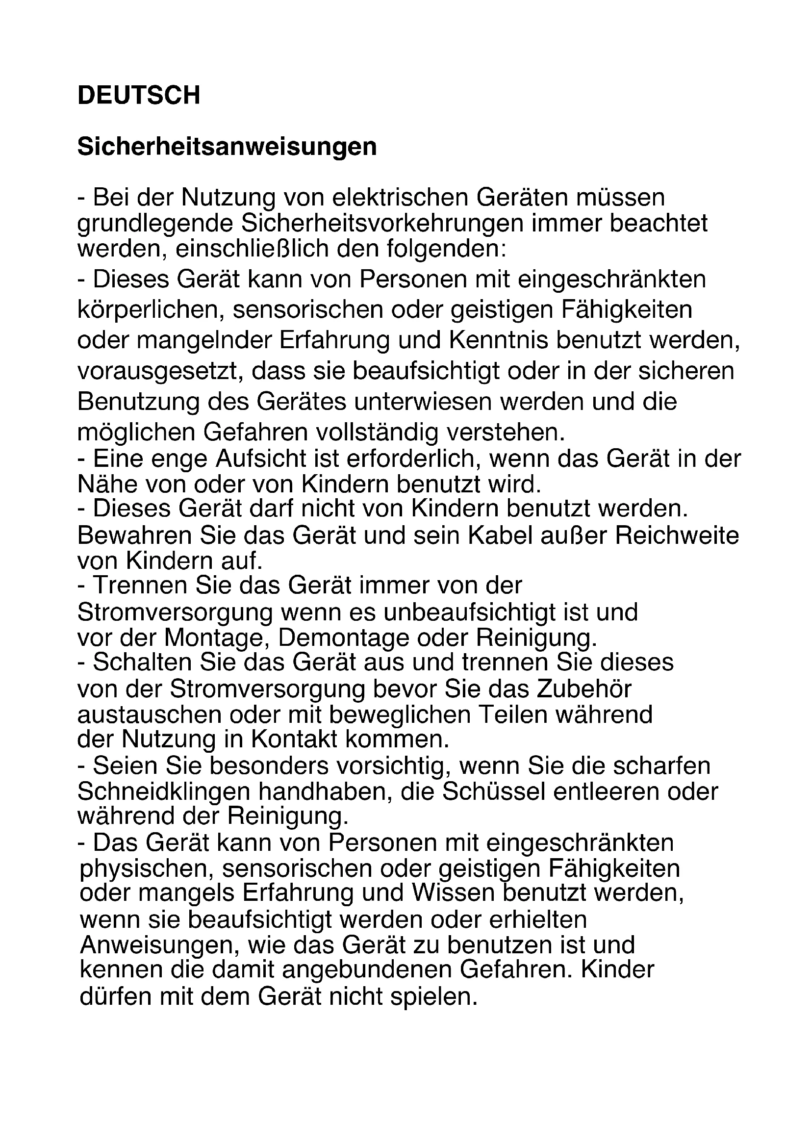 Adeva SAS / H.Koenig Europe - 8 rue Marc Seguin, 77290 Mitry-Mory, France www.hkoenig.com - https://sav.hkoenig.com - Tél: +33 1 64 67 00 05DEUTSCH Sicherheitsanweisungen - Bei der Nutzung von elektrischen Geräten müssen grundlegende Sicherheitsvorkehrungen immer beachtet werden, einschließlich den folgenden: - Dieses Gerät kann von Personen mit eingeschränkten körperlichen, sensorischen oder geistigen Fähigkeiten oder mangelnder Erfahrung und Kenntnis benutzt werden, vorausgesetzt, dass sie beaufsichtigt oder in der sicheren Benutzung des Gerätes unterwiesen werden und die möglichen Gefahren vollständig verstehen. - Eine enge Aufsicht ist erforderlich, wenn das Gerät in der Nähe von oder von Kindern benutzt wird. - Dieses Gerät darf nicht von Kindern benutzt werden. Bewahren Sie das Gerät und sein Kabel außer Reichweite von Kindern auf. - Trennen Sie das Gerät immer von der Stromversorgung wenn es unbeaufsichtigt ist und vor der Montage, Demontage oder Reinigung. - Schalten Sie das Gerät aus und trennen Sie dieses von der Stromversorgung bevor Sie das Zubehör austauschen oder mit beweglichen Teilen während der Nutzung in Kontakt kommen. - Seien Sie besonders vorsichtig, wenn Sie die scharfen Schneidklingen handhaben, die Schüssel entleeren oder während der Reinigung. - Das Gerät kann von Personen mit eingeschränkten physischen, sensorischen oder geistigen Fähigkeiten oder mangels Erfahrung und Wissen benutzt werden, wenn sie beaufsichtigt werden oder erhielten Anweisungen, wie das Gerät zu benutzen ist und kennen die damit angebundenen Gefahren. Kinder dürfen mit dem Gerät nicht spielen.- Trennen Sie das Gerät beim Nichtgebrauch von der Steckdose, bevor Sie die Teile montieren oder abnehmen, und vor der Reinigung. - Vermeiden Sie den Kontakt mit beweglichen Teilen. Halten Sie ihre Hände, Kleidungsstücke, genauso wie Spatel und andere Utensilien während des Betriebs von den Treibern fern, um Körperverletzungen und/oder Beschädigungen des Gerätes zu vermeiden. - Bedienen Sie das Gerät nicht, wenn das Kabel oder der Stecker beschädigt sind, nach einer Fehlfunktion des Gerätes, nachdem es fallen gelassen oder auf jeglicher Weise beschädigt worden ist. Bringen Sie das Gerät zu nächstliegender autorisierter Servicestelle für eine Inspektion, Reparatur oder eine elektrische oder mechanische Anpassung. - Die Nutzung des Zubehörs, das nicht von dem Hersteller empfohlen oder verkauft wurde, kann zu einem Brand, einem Stromschlag oder einer Verletzung führen. - Benutzen Sie das Gerät nicht draußen. Dieses Produkt ist ausschließlich für die Haushaltsnutzung geeignet. - Lassen Sie das Kabel über die Kante eines Tisches oder einer Theke nicht herunterhängen. - Entfernen Sie die Treiber vor der Reinigung. - Das Gerät kann durch Kinder ab 8 Jahren benutzt werden, wenn sie beaufsichtigt werden oder erhielten Anweisungen, wie das Gerät zu benutzen ist und kennen die damit angebundenen Gefahren. - Die Reinigung und Wartung dürfen nicht von Kindern durchgeführt werden, es sei denn sie sind über 8 Jahre alt und werden von einem Erwachsenen beaufsichtigt. - Bewahren Sie das Gerät und sein Kabel außer Reichweite von Kindern unter 8 Jahren auf.- Während der Nutzung von elektrischen Geräten müssen grundliegende Sicherheitsvorkehrungen immer befolgt werden, um das Risiko eines Brandes, eines Stromschlages oder/und einer Verletzung im Falle eines Missbrauchs zu vermeiden. - Vergewissern Sie sich bitte, ob die Spannung auf demTypenschild mit der Netzspannung Ihrer Einrichtung übereinstimmt. Wenn dies nicht der Fall ist, kontaktieren Sie den Händler und schließen Sie das Gerät nicht an. - Bewahren Sie diese Anleitung als künftige Referenz auf und geben Sie diese an künftige Nutzer zusammen mit dem Gerät weiter. - Das Gerät darf nur im Haushalt und in Innenräumen benutzt werden. - Ihr Gerät ist nur für den Hausgebrauch bestimmt. Es ist nicht für die Verwendung in den folgenden Situationen vorgesehen, die nicht von der Garantie abgedeckt sind: - in Personalküchen in Geschäften, Büros und anderen professionellen Umgebungen, - in Landgasthöfen, - von Gästen in Hotels, Motels und anderen Wohnumgebungen, - in Bed-and-Breakfast-Umgebungen.