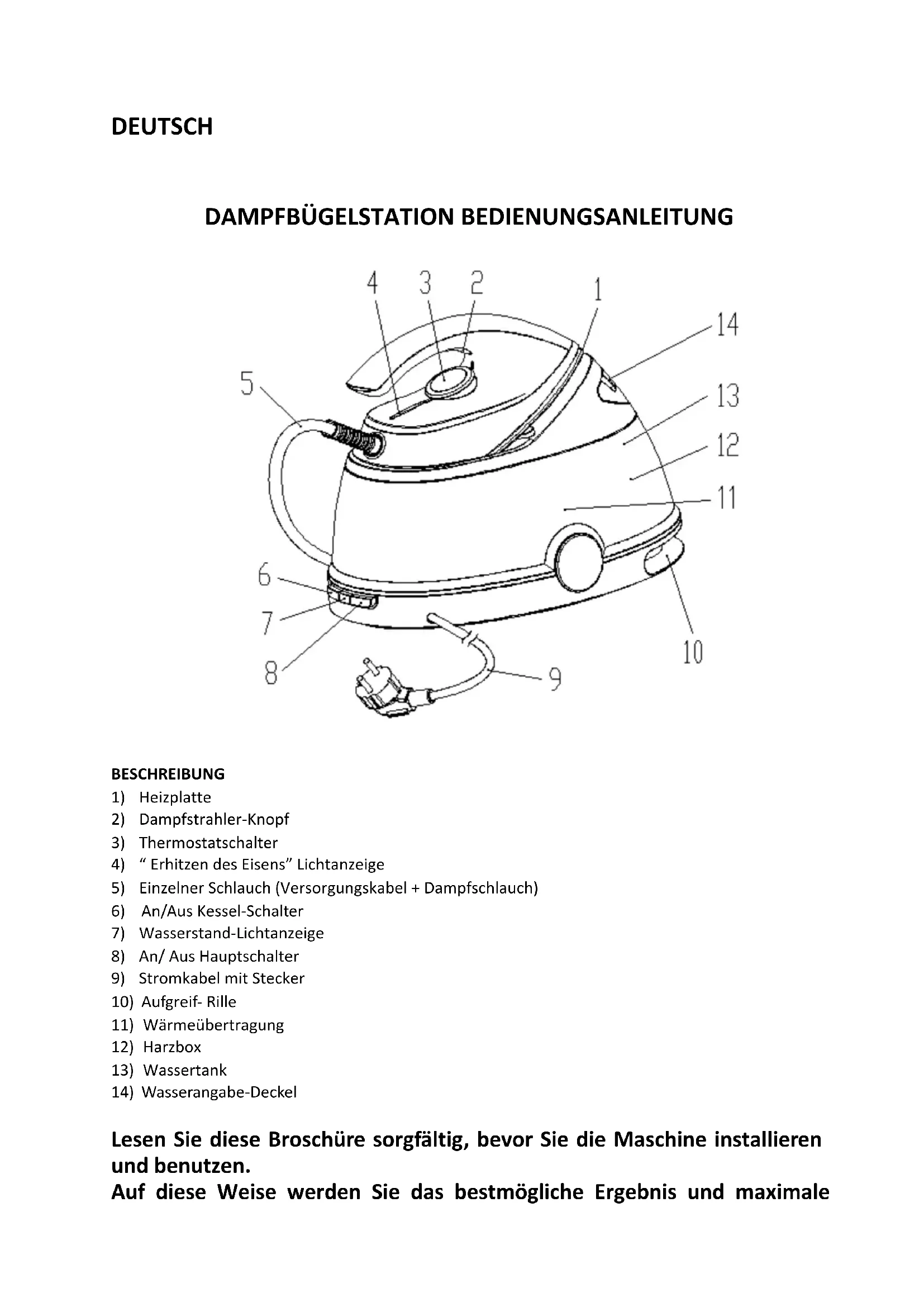 Lesen Sie diese Broschüre sorgfältig, bevor Sie die Maschine installieren und benutzen. Auf diese Weise werden Sie das bestmögliche Ergebnis und maximaleSicherheit erzielen. SICHERHEITSHINWEISE Lesen Sie die folgenden Anweisungen sorgfältig: - Vor dem Gebrauch, überprüfen Sie, dass die Stromversorgung mit der auf dem Nummernschild angegebenen Spannung übereinstimmt. Verbinden Sie das Gerät nur mit einer ordnungsgemäß geerdeten Steckdose (Mindestens 10A). - Im Falle von Inkompatibilität zwischen dem Stecker und Ihrer Steckdose, lassen Sie die Steckdose von einer qualifizierten Elektrofachkraft ersetzen. - Die elektrische Sicherheit von diesem Gerät ist nur dann garantiert, wenn es korrekt, gemäß aktuellen elektrischen Sicherheitsvorschriften geerdet worden ist. Der Hersteller lehnt jede Verantwortung für Schäden, die durch eine unangemessene Erdung des Gerätes entstanden sind. Im Zweifelsfall, wenden Sie sich an eine qualifizierte Elektrofachkraft. - Lassen Sie kein Wasser in der Maschine, wenn die Raumtemperatur 0℃ oder weniger beträgt. - Nach dem Auspacken, überprüfen Sie das Gerät auf Beschädigungen, im Zweifelsfall benutzen Sie das Gerät nicht; kontaktieren Sie einen qualifizierten Techniker. - Verpackungsmaterialien (Plastiktüten, Schaumpolyestern usw.) sind eine potentielle Gefahrenquelle und müssen außer Reichweite von Kindern aufbewahrt werden. Es wird nicht empfohlen, Adapter, Mehrfachsteckdosen oder Verlängerungskabel zu benutzen. Falls es unvermeidlich ist, nutzen Sie immer Adapter, Mehrfachsteckdosen oder Verlängerungskabel, die den aktuellen Sicherheitsvorschriften entsprechen. Überschreiten Sie die auf dem Adapter angegebene maximale Nennleistung nicht. - Das Gerät ist ausschließlich für die Haushaltsnutzung geeignet. Jede andere Verwendung wird als unsachgemäßund dementsprechend gefährlich betrachtet. - Der Hersteller lehnt jede Verantwortung für Schäden, die durch eine unsachgemäße, inkorrekte oder achtlose Nutzung des Gerätes entstehen. - Bei der Nutzung jedes Elektrogerätes müssen einige Grundregel beachtet werden: - Wenn das Stromkabel beschädigt ist, muss es von dem Hersteller oder seinem Dienstleister, oder einer ähnlich qualifizierten Person ersetzt werden, um Gefährdungen zu vermeiden. Insbesondere: - Fassen Sie das Gerät nicht mit nassen oder feuchten Händen oder Füssen an. - Benutzen Sie das Gerät nicht in Badezimmern. - Ziehen Sie nicht an dem Stromkabel oder dem Gerät, um den Stecker aus der Steckdose zu entfernen. - Lassen Sie das Gerät nicht den Witterungseinflüssen ausgesetzt (Regen, Sonne, Frost usw.) - Erlauben Sie keinen Kindern und unverantwortlich handelnden Personen das Gerät zu bedienen, es sei den sie werden beaufsichtigt. - Tauchen Sie das Gerät nicht in Wasser. - Lassen Sie das Eisen nicht unbeaufsichtigt, wenn es angeschaltet ist, da es eine Gefahrenquelle sein kann. - Bevor Sie Reinigungs- oder Wartungshandlungen durchführen, trennen Sie das Gerät immer von der Hauptstromversorgung, indem Sie den Stecker ziehen. - Im Falle von Versagen oder einer Fehlfunktion, schalten Sie das Gerät aus und versuchen Sie es nicht, Reparaturen durchzuführen. Kontaktieren Sie ein autorisiertes Service- Zentrum und bestehen Sie darauf, originale Ersatzteile zu bekommen. Nichtbeachtung von den obengenannten Regeln kann die Sicherheit des Gerätes beeinträchtigen.- Sollten Sie sich dafür entscheiden, das Gerät nicht mehr zu benutzen, entfernen Sie den Stecker aus der Steckdose und schneiden Sie das Stromkabel durch, um das Gerät komplett funktionsunfähig zu machen. - Das Stromkabel darf von dem Nutzer nicht ersetzt werden, weil dies spezielles Werkzeug benötigt; wenn das Stromkabel beschädigt ist, kontaktieren Sie ein qualifiziertes Service- Zentrum. - Erlauben Sie dem Stromkabel nicht, mit der Bügelplatte in Kontakt zu kommen. - Wenn die Sicherheitsabschaltung interveniert, wird das Eisen nicht mehr funktionieren. Um einen normalen Betrieb wiederherzustellen, kontaktieren Sie eine qualifizierte Fachkraft. - Richten Sie den Dampfstrahler nicht auf eine Person, dies kann extrem gefährlich sein. - Benutzen Sie nicht das Eisen auf nassen Stoffen. - Platzieren Sie nicht das Bügeleisen in der Nähe von Personen, wenn die Platte heiß ist. - Überfüllen Sie den Wassertank nicht und fügen Sie keine Fleckentferner oder ähnliche Produkte zum Wasser hinzu. - Entfernen Sie den Stecker aus der Netzsteckdose, wenn das Gerät nicht benutzt wird. Lassen Sie das Gerät nicht unnötig an. - EWG Richtlinie 87/308(D.M. 13/04/89) 。Bewähren Sie die Broschüre als künftige Referenz auf. Dieses Gerät entspricht EWG Richtlinie 87/308(D.M. 13/04/89 bezüglich der Unterdrückung von Funkstörungen.VORBEREITUNG FÜR DEN GEBRAUCH Das Gerät verwendet normales Leitungswasser. Bei sehr hartem Wasser (die Härte höher als 27 Grad (französisch)) empfehlen wir Ihnen, destilliertes oder entmineralisiertes Wasser zu benutzen. Bevor Sie das Gerät benutzen, öffnen Sie die Klappe für Wasser (14) und fügen Sie die richtige Menge Wasser in den Wassertank (13) hinzu, aber unter dem maximalen (MAX) Wasserpegel. Schließen Sie das Gerät ans Netz an. Drücken Sie auf den Hauptschalter (8), auf den Kessel-Schalter (6), die Lichtanzeige des Hauptschalters (8) und Kessel-Schalters (6) wird angehen, was darauf hinweist, dass die Wärmeübertragung und das Bügeleisen angeschaltet sind. Wählen Sie die gewünschte Temperatur, indem Sie den Thermostatschalter (3) drehen. Der bunte Teil zeigt den Dampfbügel-Sektor an. Es dauert ungefähr 90 Sekunden. Wenn die “ Erhitzen des Eisens” Lichtanzeige (4) aus geht, ist die Maschine bereit, den Dampf zu liefern.