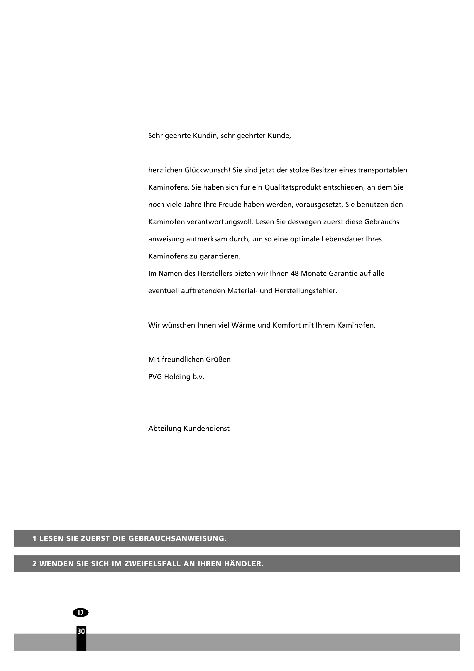 Sehr geehrte Kundin, sehr geehrter Kunde, herzlichen Glückwunsch! Sie sind jetzt der stolze Besitzer eines transportablen Kaminofens. Sie haben sich für ein Qualitätsprodukt entschieden, an dem Sie noch viele Jahre Ihre Freude haben werden, vorausgesetzt, Sie benutzen den Kaminofen verantwortungsvoll. Lesen Sie deswegen zuerst diese Gebrauchs- anweisung aufmerksam durch, um so eine optimale Lebensdauer Ihres Kaminofens zu garantieren. Im Namen des Herstellers bieten wir Ihnen 48 Monate Garantie auf alle eventuell auftretenden Material- und Herstellungsfehler. Wir wünschen Ihnen viel Wärme und Komfort mit Ihrem Kaminofen. Mit freundlichen Grüßen PVG Holding b.v. Abteilung Kundendienst 1 LESEN SIE ZUERST DIE GEBRAUCHSANWEISUNG. 2 WENDEN SIE SICH IM ZWEIFELSFALL AN IHREN HÄNDLER.