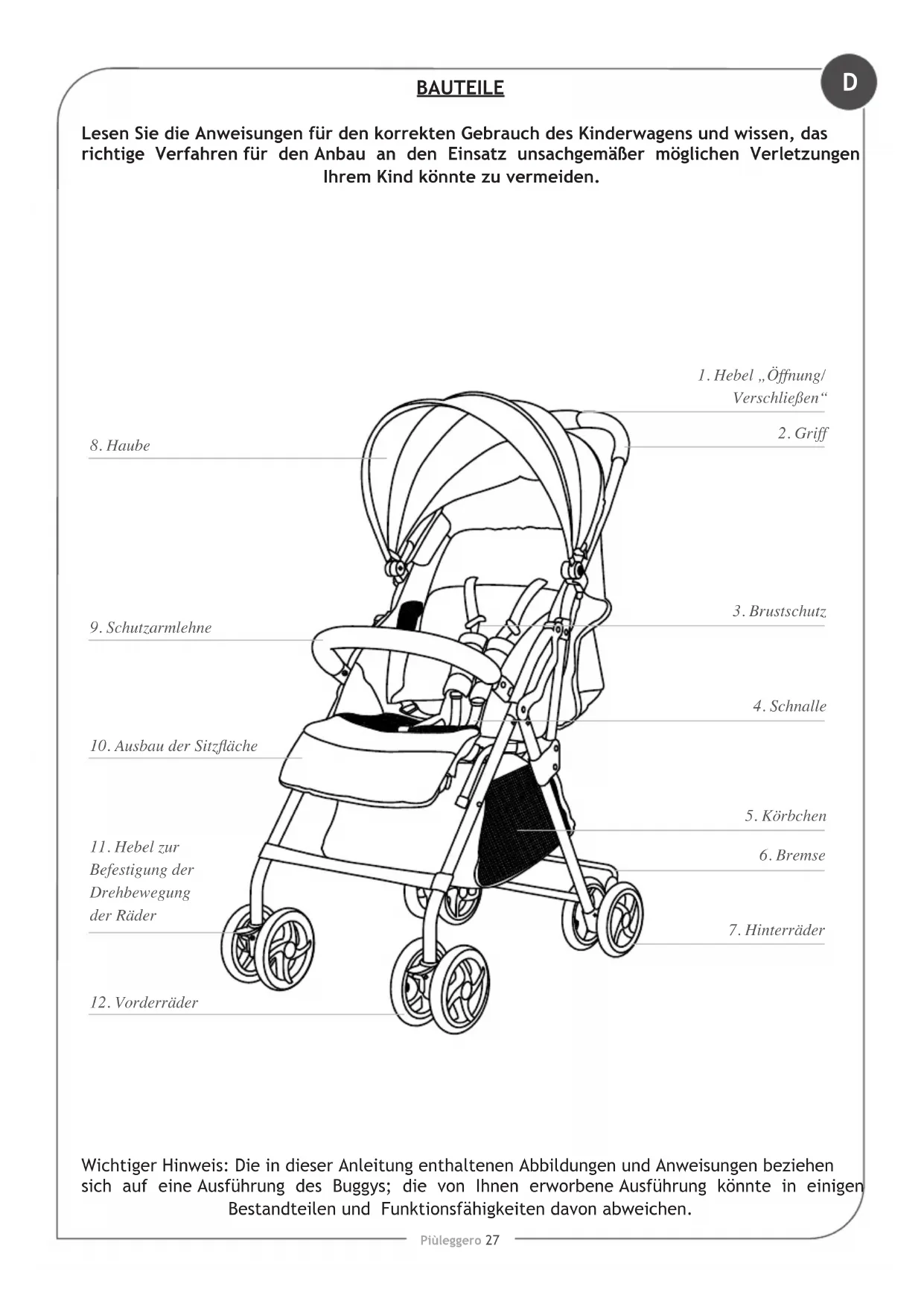 Wichtiger Hinweis: Die in dieser Anleitung enthaltenen Abbildungen und Anweisungen beziehen sich auf eine Ausführung des Buggys; die von Ihnen erworbene Ausführung könnte in einigen Bestandteilen und Funktionsfähigkeiten davon abweichen.D Piùleggero 28 MONTAGE AUFKLAPPEN DES BUGGYS (Abb.1) Den Knopf “a” nach rechts schieben, wie Abgebildet und gleichzeitig die Taste “b” drücken. Den Griff bis zum vollständigen Aufklappen des Gestells anheben. Ein Klick zeigt das korrekte Einrasten an. Vor der Verwendung des Buggys überprüfen, ob dieser richtig aufgeklappt und der Mechanismus korrekt verriegelt ist. VORDERRÄDER (Abb.2) Montage der Vorderräder: Den Rahmen mit einer Hand anheben und die Vorderräder einfügen. Dabei soll der Befestigungshebel auf der Nabe des Rades nach oben zeigen. Ein Geräusch zeigt Ihnen das korrekte Einrasten an. Das korrekte Einhaken beider Räder überprüfen. Durch ein nach unten Ziehen dürfen sie nicht abgehen. Abmontage der Vorderräder: Die Befestigungsvorrichtung “a” im unteren Teil des Rades drücken und gedrückt halten. Das Rad von der Nabe abziehen. HINTERRÄDER (Abb.3) Montage der hinterräder: Hinterradbaugruppe in das Gestell einschieben, bis sie vollständig eingerastet ist. Prüfen, ob die Halterung an beiden Seiten des Gestells richtig eingerastet ist. Die Radhalterung ist richtig zusammengebaut, wenn die Metallstifte in die Löcher in die Löcher an den Gestellrohren einrasten. Abmontage der Hinterräder: Die Befestigungsvorrichtung “a” im unteren Teil Bein drücken und gedrückt halten. Das Befestigungsvorrichtung von Halterung Befestigungsvorrichtung abziehen. MONTAGE DES VERDECKS (Abb.4) Montage: Die Clips “a” aus Kunststoff in die entsprechenden Führungen auf beiden Seiten des Buggys einsetzen “b”. Ein Klick zeigt die richtige Befestigung an. Demontage: Herausziehen den Hebel “c” und anheben, um das Verdeck zu entfernen. MONTAGE DER SCHUTZARMLEHNE (Abb.5) Montage: Die Armlehne an ihren Sitzen ausrichten und von beiden Seiten drücken. Ein Klick wird Ihnen das korrekte Einrasten anzeigen. Abmontage: Den Druckknopf “a” von beiden Seiten der Armlehne drücken und gleichzeitig ziehen, um sie zu entfernen. Öffnung von nur einer Seite: Den Druckknopf “a” von einer Seite der Armlehne drücken und ziehen, um sie wie ein Türchen zu öffnen. UNTERER KORB Der Korb wird am unteren Teil des Rahmens. Es empehlt sich, den Korb zu entleeren, bevor der Buggy geschlossen wird. VERWENDUNG HALTEBREMSE (Abb.6) Bremse aktivieren: Den Bremshebel drücken, den Buggy leicht nach vorne drücken, um sicherzustellen, dass die Bremse korrekt aktiviert ist. Um die Bremse zu löschen: wie in der Abbildung gezeigt den Hebel “Bremse” drücken sie.D Piùleggero 29 VERWENDUNG EINSTELLUNG DER FUßSTÜTZEN (Abb.7) Die Druckknöpfe “A” drücken und die Fußstützen in der gewählten Position einstellen. EINSTELLUNG DER HAUBE (Abb.8) Die Haube nach Ihren Notwendigkeiten einstellen, um das Kind vor Sonnenstrahlen zu schützen. Achtung: Das Kind hat eine empndliche Haut. Das Kind NIE direkt den Sonnenstrahlen aussetzen. Stellen Sie immer sicher, dass Sie die Haube korrekt reguliert haben. Den Reißverschluss, die Haube nach Ihren Notwendigkeiten einstellen, um das Kind vor Sonnenstrahlen zu schützen. FREIGEBEN DER DREHBEWEGUNG DER VORDERRÄDER (Abb.9A) Drücken Sie, wie in Abbildung 4 gezeigt, beide Hebel. BLOCKIEREN DER DREHBEWEGUNG DER VORDERRÄDER (Abb.9B) Heben Sie, wie in Abbildung gezeigt, die Hebel an beiden Rädern an. GURTSYSTEM (Abb.10-11) Vor dem Hineinsetzen des Kindes die Bremse betätigen. Öffnen des Gurtschlosses: Den Knopf “A” drücken und die Schlosszungen herausziehen. Das Kind in den Buggy setzen und das Gurtsystem entsprechend seiner Körpergröße einstellen (Abb.11). Schließen des Gurtschlosses: Teil “a” in Teil “b” einführen, ein Klicken zeigt das richtige Einrasten an. Stets das Rückhaltesystem gut verschlossen verwenden. WICHTIG: Wenn das Kind weniger als 6 Monate alt ist, so müssen die Brustgurte zunächst in die unteren Schlaufen. EINSTELLUNG DES RÜCKENTEILS (Abb. 12) Ziehen Sie, wie in Abbildung 12A gezeigt, mit einer Hand am Riemen und halten Sie die Einstellvorrichtung mit der anderen. Schieben Sie die Vorrichtung auf dem Riemen zur Vorderseite hin, um das Rückenteil nach vorn, oder zur Rückseite hin, um es nach hinten zu neigen. Lassen Sie die Einstellvorrichtung los, um das Rückenteil in der gewählten Position zu blockieren. Wir empfehlen, die Einstellung des Rückenteils vorzunehmen, wenn das Kind nicht darin sitzt. WICHTIG: Für Kinder von weniger als 6 Monaten muss das Rückenteil immer und ausschließlich in der niedrigsten, horizontalen Position verwendet werden. ZUSAMMENKLAPPEN DES BUGGYS (Abb.13) Vor dem Zusammenklappen des Buggys sicherstellen, dass: