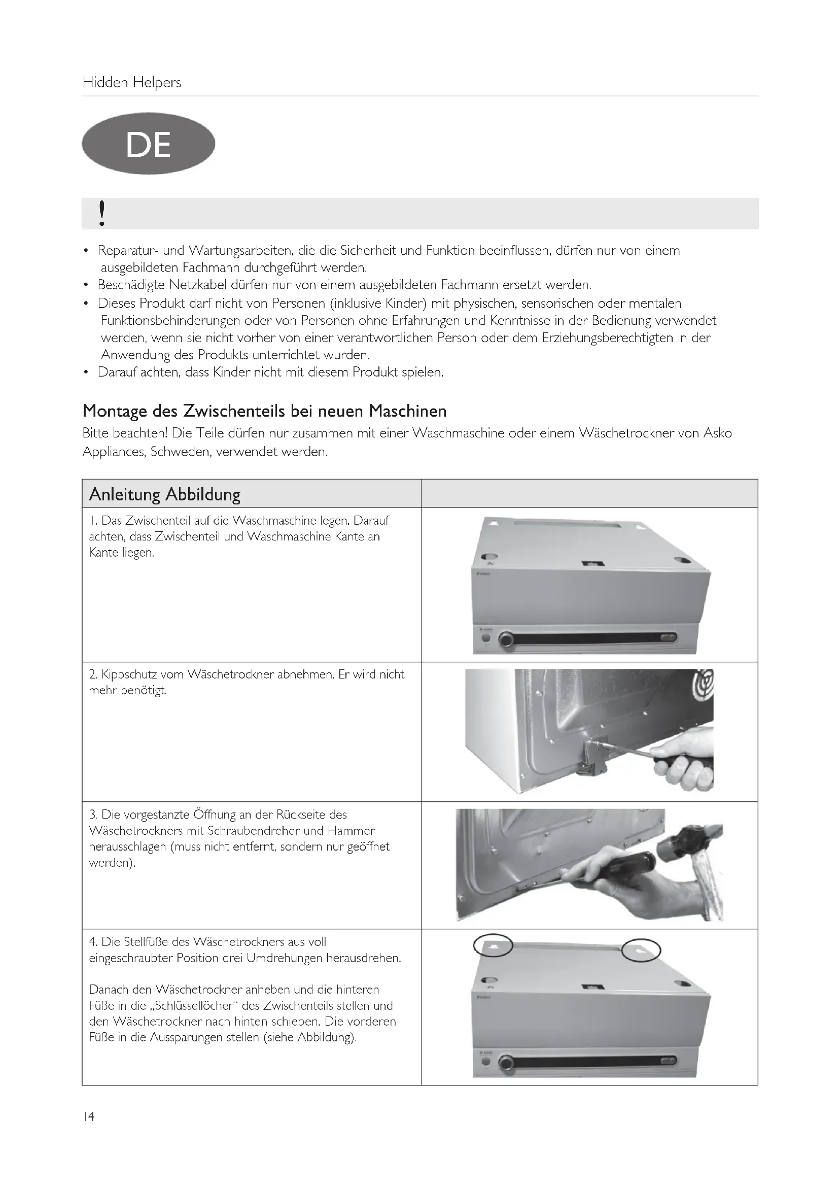 - Darauf achten, dass Kinder nicht mit diesem Produkt spielen. Montage des Zwischenteils bei neuen Maschinen Bitte beachten! Die Teile dürfen nur zusammen mit einer Waschmaschine oder einem Wäschetrockner von Asko Appliances, Schweden, verwendet werden. Anleitung Abbildung