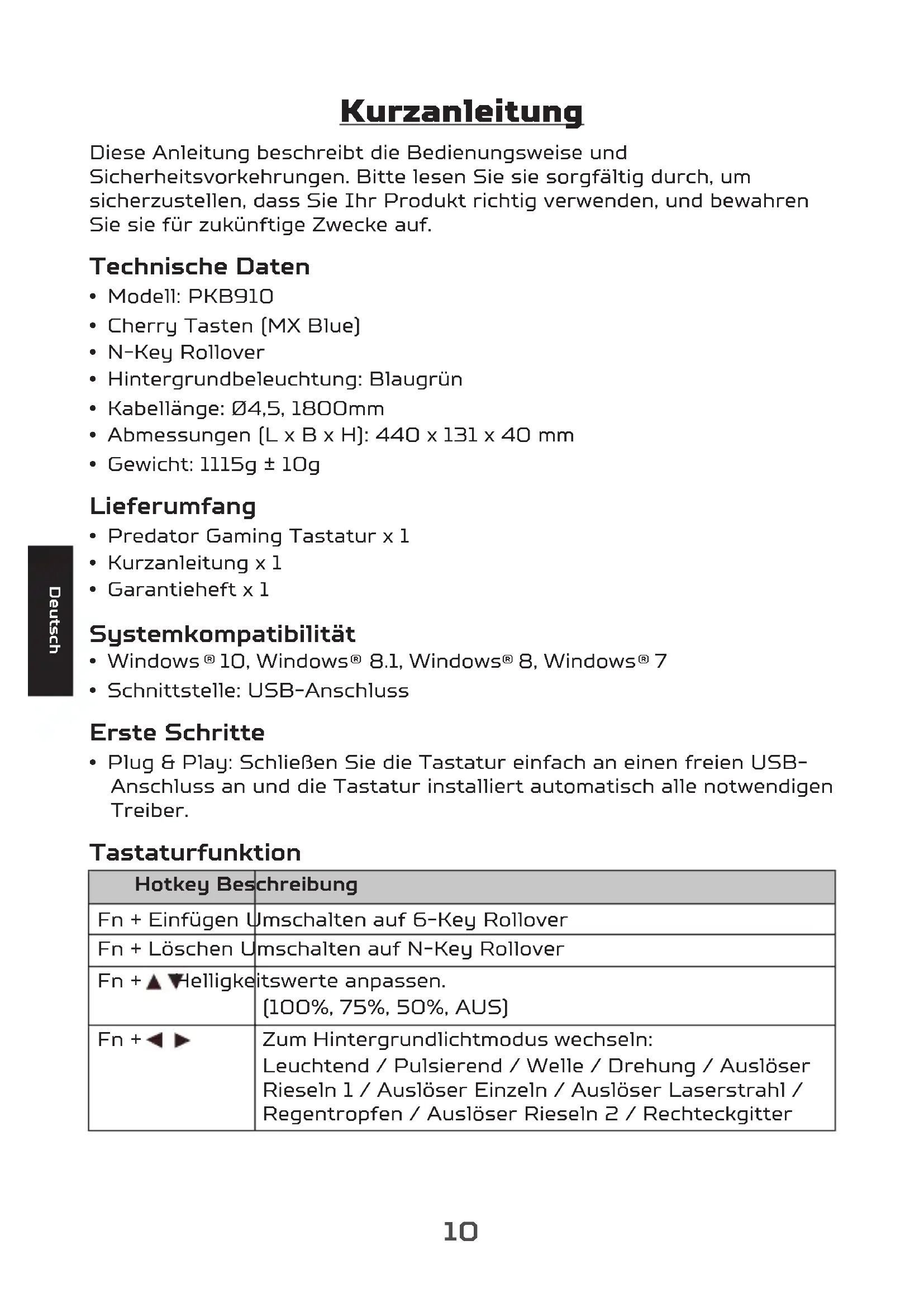 - Plug & Play: Schließen Sie die Tastatur einfach an einen freien USB- Anschluss an und die Tastatur installiert automatisch alle notwendigen Treiber. Tastaturfunktion Hotkey Beschreibung Fn + Einfügen Umschalten auf 6-Key Rollover Fn + Löschen Umschalten auf N-Key Rollover Fn + Helligkeitswerte anpassen. (100%, 75%, 50%, AUS) Fn + Zum Hintergrundlichtmodus wechseln: Leuchtend / Pulsierend / Welle / Drehung / Auslöser Rieseln 1 / Auslöser Einzeln / Auslöser Laserstrahl / Regentropfen / Auslöser Rieseln 2 / Rechteckgitter11 Deutsch Hotkey Beschreibung Fn + Pos1 Sofortige Makroaufzeichnung Schritt 1: Drücken Sie Fn + F6. Die Windows Tastensperre wird aktiviert. Schritt 2: Drücken Sie Fn + Pos1, die LED wird blinken. Schritt 3: Weisen Sie eine Taste zu, die Sie speichern möchten, die LED blinkt schneller. Schritt 4: Tippen Sie die Taste an, die in der Makroliste steht. Schritt 5: Drücken Sie Fn + Pos1, beenden Sie die sofortige Makroaufzeichnung. Die Aufnahme wird beendet, wenn innerhalb von 20 Sekunden keine Aktion ausgeführt wird. Hinweise zum Komfort Forschungsergebnisse legen nahe, dass lange Zeiträume sich wiederholender Bewegungen bei Verwendung eines unsachgemäßen Aktionsraumes, Körperhaltung und schlechte Arbeitsgewohnheiten mit körperlichen Beschwerden und Verletzungen von Nerven, Sehnen und Muskeln in Verbindung gebracht werden können. Nachfolgend finden Sie einige Hinweise zur Optimierung des Benutzerkomforts und zur Vermeidung von Verletzungen.