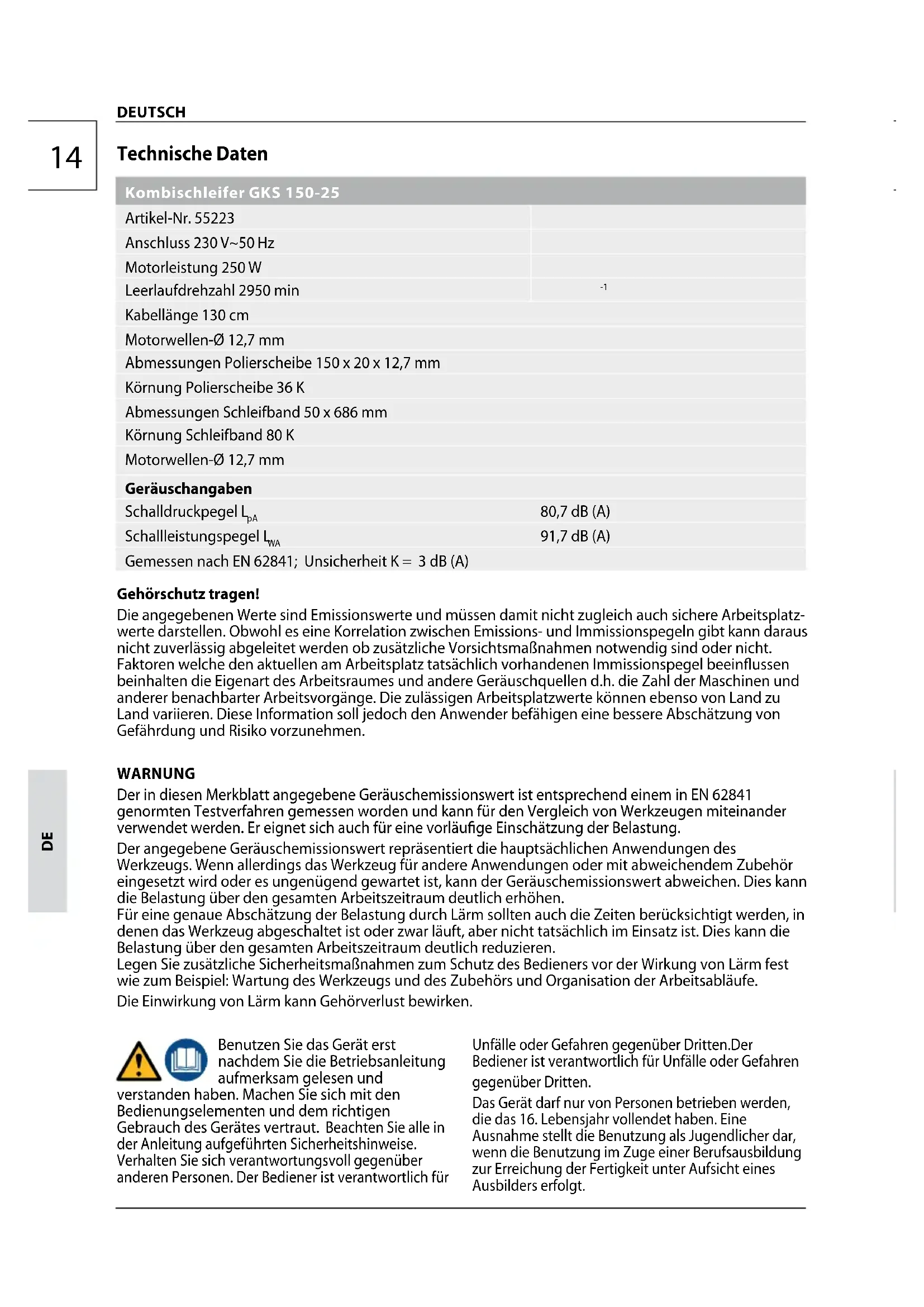 91,7 dB (A) Gemessen nach EN 62841; Unsicherheit K = 3 dB (A) Gehörschutz tragen! Die angegebenen Werte sind Emissionswerte und müssen damit nicht zugleich auch sichere Arbeitsplatz- werte darstellen. Obwohl es eine Korrelation zwischen Emissions- und Immissionspegeln gibt kann daraus nicht zuverlässig abgeleitet werden ob zusätzliche Vorsichtsmaßnahmen notwendig sind oder nicht. Faktoren welche den aktuellen am Arbeitsplatz tatsächlich vorhandenen Immissionspegel beeinussen beinhalten die Eigenart des Arbeitsraumes und andere Geräuschquellen d.h. die Zahl der Maschinen und anderer benachbarter Arbeitsvorgänge. Die zulässigen Arbeitsplatzwerte können ebenso von Land zu Land variieren. Diese Information soll jedoch den Anwender befähigen eine bessere Abschätzung von Gefährdung und Risiko vorzunehmen. WARNUNG Der in diesen Merkblatt angegebene Geräuschemissionswert ist entsprechend einem in EN 62841 genormten Testverfahren gemessen worden und kann für den Vergleich von Werkzeugen miteinander verwendet werden. Er eignet sich auch für eine vorläuge Einschätzung der Belastung. Der angegebene Geräuschemissionswert repräsentiert die hauptsächlichen Anwendungen des Werkzeugs. Wenn allerdings das Werkzeug für andere Anwendungen oder mit abweichendem Zubehör eingesetzt wird oder es ungenügend gewartet ist, kann der Geräuschemissionswert abweichen. Dies kann die Belastung über den gesamten Arbeitszeitraum deutlich erhöhen. Für eine genaue Abschätzung der Belastung durch Lärm sollten auch die Zeiten berücksichtigt werden, in denen das Werkzeug abgeschaltet ist oder zwar läuft, aber nicht tatsächlich im Einsatz ist. Dies kann die Belastung über den gesamten Arbeitszeitraum deutlich reduzieren. Legen Sie zusätzliche Sicherheitsmaßnahmen zum Schutz des Bedieners vor der Wirkung von Lärm fest wie zum Beispiel: Wartung des Werkzeugs und des Zubehörs und Organisation der Arbeitsabläufe. Die Einwirkung von Lärm kann Gehörverlust bewirken. Benutzen Sie das Gerät erst nachdem Sie die Betriebsanleitung aufmerksam gelesen und verstanden haben. Machen Sie sich mit den Bedienungselementen und dem richtigen Gebrauch des Gerätes vertraut. Beachten Sie alle in der Anleitung aufgeführten Sicherheitshinweise. Verhalten Sie sich verantwortungsvoll gegenüber anderen Personen. Der Bediener ist verantwortlich für Unfälle oder Gefahren gegenüber Dritten.Der Bediener ist verantwortlich für Unfälle oder Gefahren gegenüber Dritten. Das Gerät darf nur von Personen betrieben werden, die das 16. Lebensjahr vollendet haben. Eine Ausnahme stellt die Benutzung als Jugendlicher dar, wenn die Benutzung im Zuge einer Berufsausbildung zur Erreichung der Fertigkeit unter Aufsicht eines Ausbilders erfolgt. DEUTSCH15