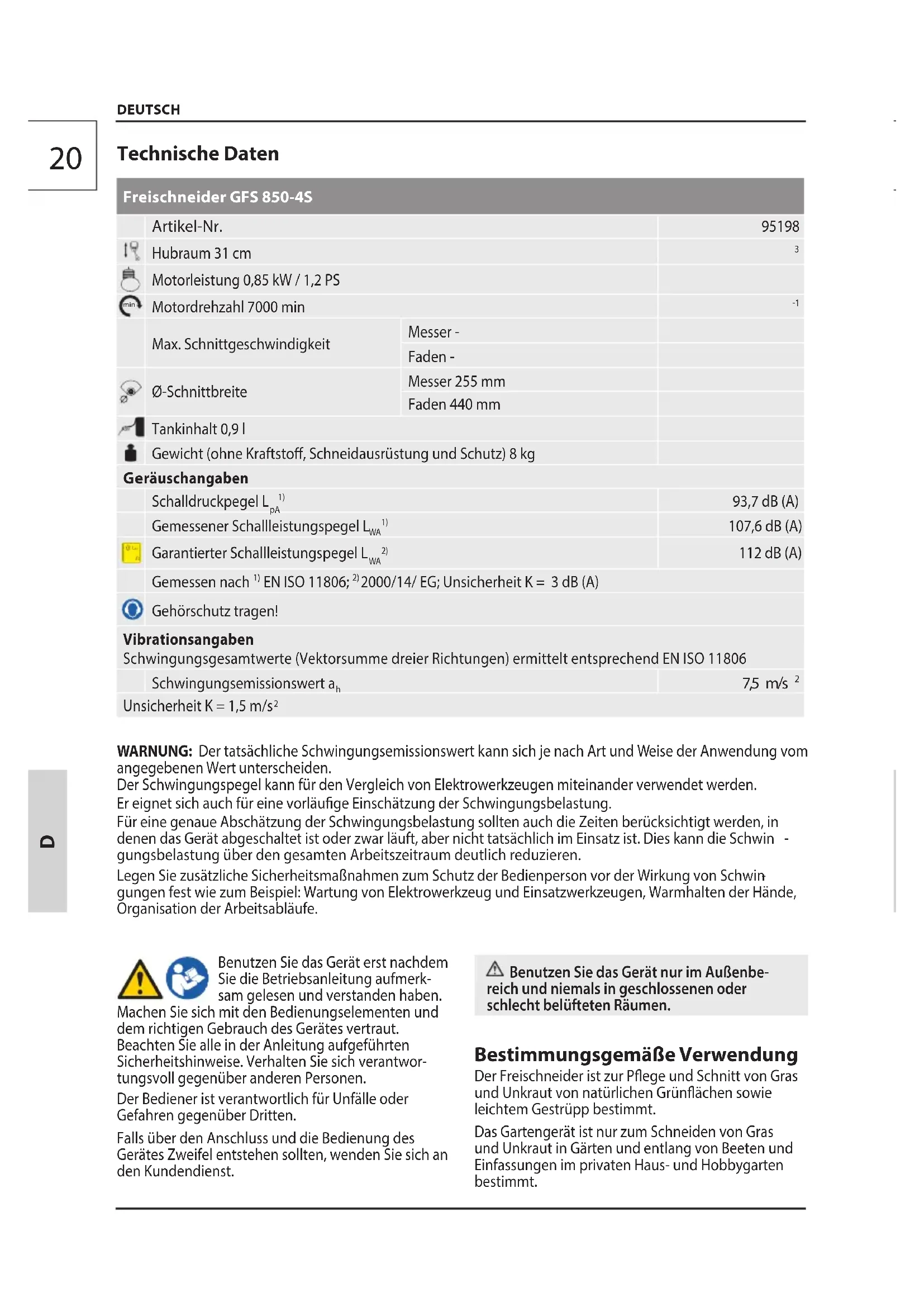 Technische Daten Freischneider GFS 850-4S Artikel-Nr.