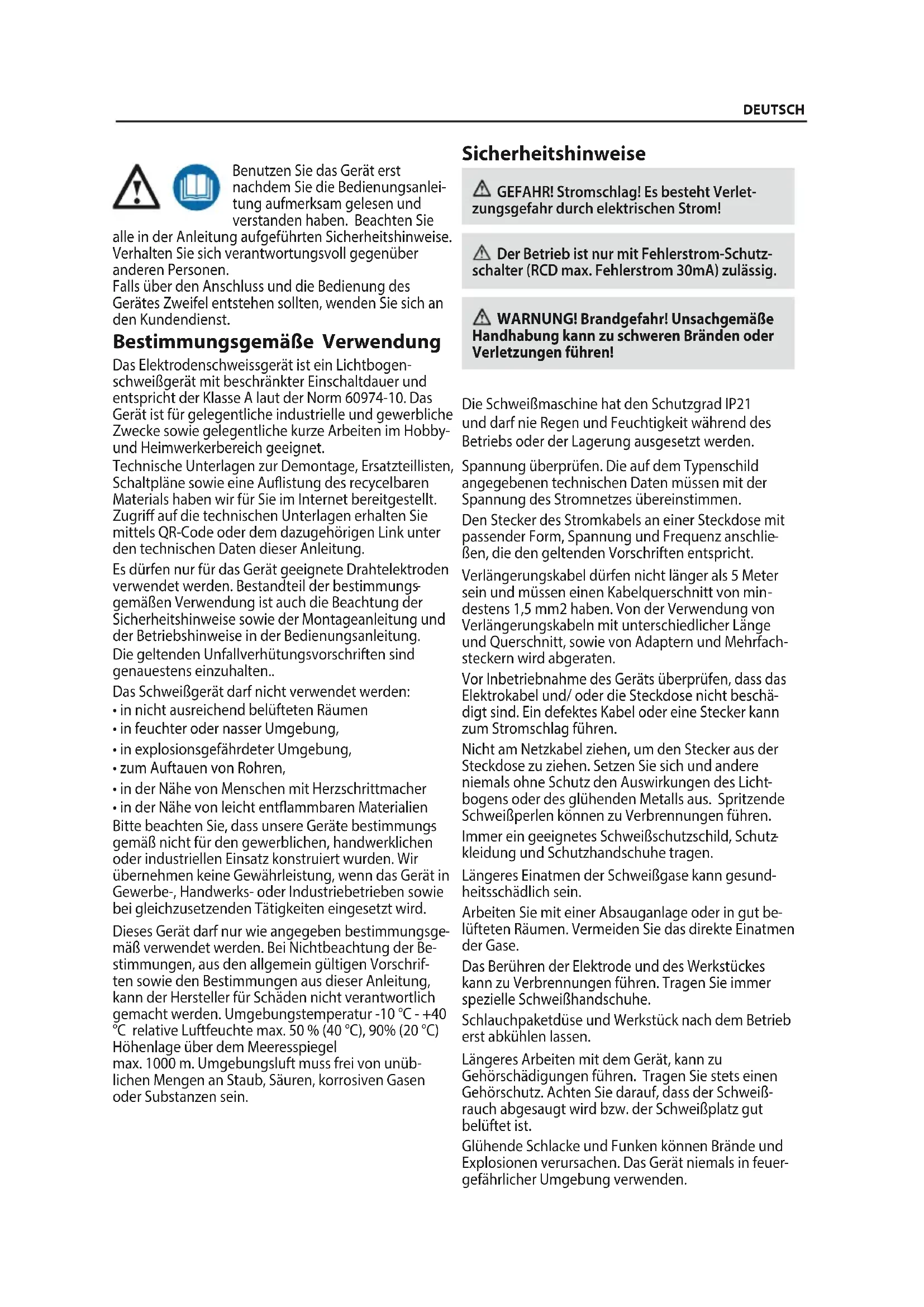 FuncionamientoSicherheitshinweise GEFAHR! Stromschlag! Es besteht Verlet- zungsgefahr durch elektrischen Strom! Der Betrieb ist nur mit Fehlerstrom-Schutz- schalter (RCD max. Fehlerstrom 30mA) zulässig. WARNUNG ! Brandgefahr! Unsachgemäße Handhabung kann zu schweren Bränden oder Verletzungen führen! Die Schweißmaschine hat den Schutzgrad IP21 und darf nie Regen und Feuchtigkeit während des Betriebs oder der Lagerung ausgesetzt werden. Spannung überprüfen. Die auf dem Typenschild angegebenen technischen Daten müssen mit der Spannung des Stromnetzes übereinstimmen. Den Stecker des Stromkabels an einer Steckdose mit passender Form,Spannung und Frequenz anschlie