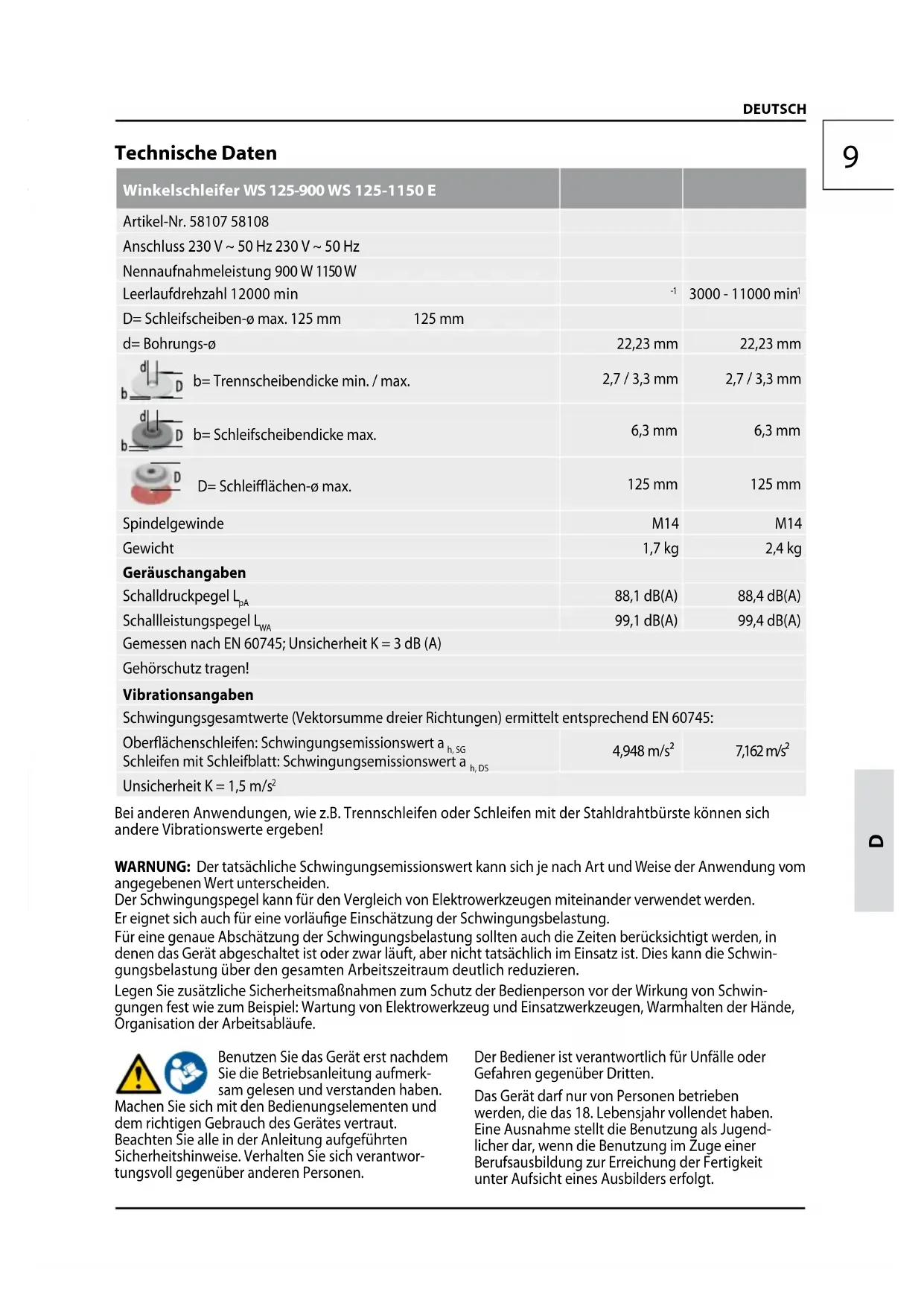 DEUTSCH Technische Daten Winkelschleifer WS 125-900 WS 125-1150 E Artikel-Nr. 58107 58108 Anschluss 230 V ~ 50 Hz 230 V ~ 50 Hz Nennaufnahmeleistung 900 W 1150 W Leerlaufdrehzahl 12000 min
