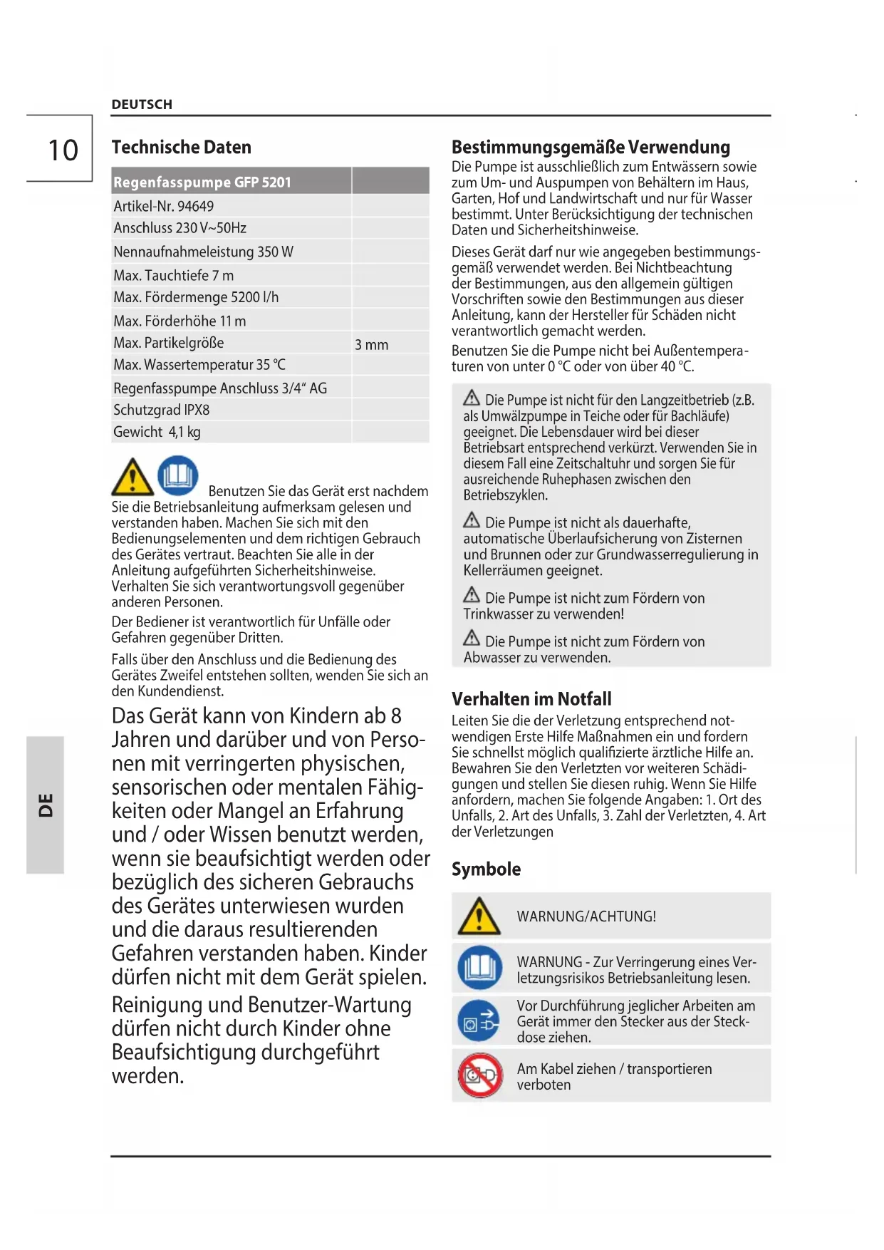 turen von unter 0 °C oder von über 40 °C. Die Pumpe ist nicht für den Langzeitbetrieb (z.B. als Umwälzpumpe in Teiche oder für Bachläufe) geeignet. Die Lebensdauer wird bei dieser Betriebsart entsprechend verkürzt. Verwenden Sie in diesem Fall eine Zeitschaltuhr und sorgen Sie für ausreichende Ruhephasen zwischen den Betriebszyklen. Die Pumpe ist nicht als dauerhafte, automatische Überlaufsicherung von Zisternen und Brunnen oder zur Grundwasserregulierung in Kellerräumen geeignet. Die Pumpe ist nicht zum Fördern von Trinkwasser zu verwenden! Die Pumpe ist nicht zum Fördern von Abwasser zu verwenden. Verhalten im Notfall Leiten Sie die der Verletzung entsprechend not- wendigen Erste Hilfe Maßnahmen ein und fordern Sie schnellst möglich qualizierte ärztliche Hilfe an. Bewahren Sie den Verletzten vor weiteren Schädi- gungen und stellen Sie diesen ruhig. Wenn Sie Hilfe anfordern, machen Sie folgende Angaben: 1. Ort des Unfalls, 2. Art des Unfalls, 3. Zahl der Verletzten, 4. Art der Verletzungen Symbole WARNUNG/ACHTUNG! WARNUNG - Zur Verringerung eines Ver- letzungsrisikos Betriebsanleitung lesen. Vor Durchführung jeglicher Arbeiten am Gerät immer den Stecker aus der Steck- dose ziehen. Am Kabel ziehen / transportieren verbotenD