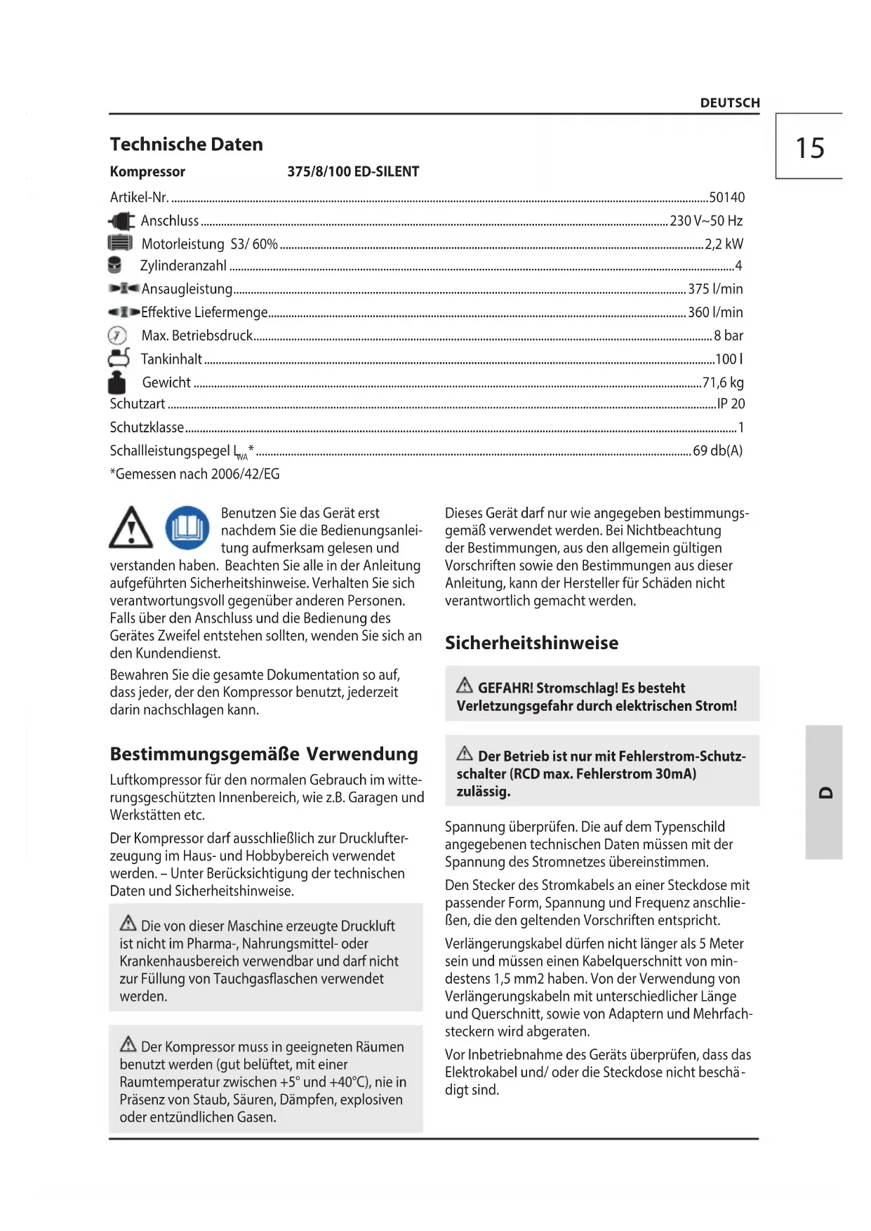 digt sind. Technische Daten Kompressor 375/8/100 ED-SILENT16 Fremdkörpern zu schützen, die vomDruckluftstrahl aufgewirbelt werden. Bei Benutzung von pneumatischem Zubehör mög