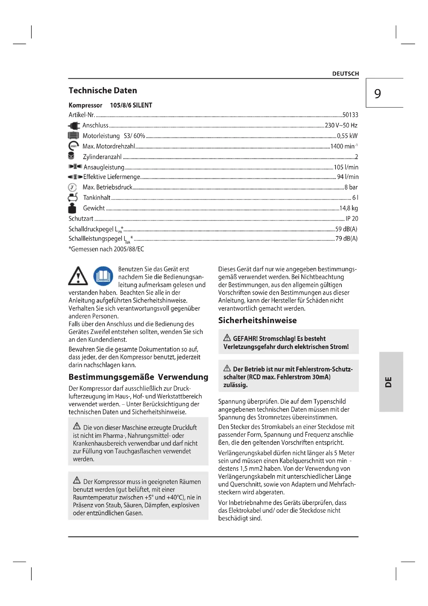 - destens 1,5 mm2 haben. Von der Verwendungvon Verlängerungskabeln mit unterschiedlicher Länge und Querschnitt,sowie von Adaptern und Mehrfach- steckern wird abgeraten. Vor Inbetriebnahme des Geräts überprüfen, dass das Elektrokabel und/ oder die Steckdose nicht beschädigt sind. DEUTSCH Technische Daten Kompressor 105/8/6 SILENT Artikel-Nr p. 5013