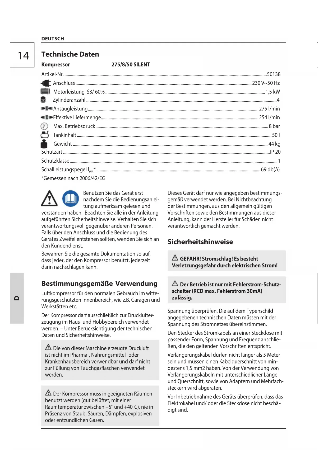 digt sind. Technische Daten Kompressor 275/8/50 SILENT15 Fremdkörpern zu schützen, die vomDruckluftstrahl aufgewirbelt werden. Bei Benutzung von pneumatischem Zubehör mög