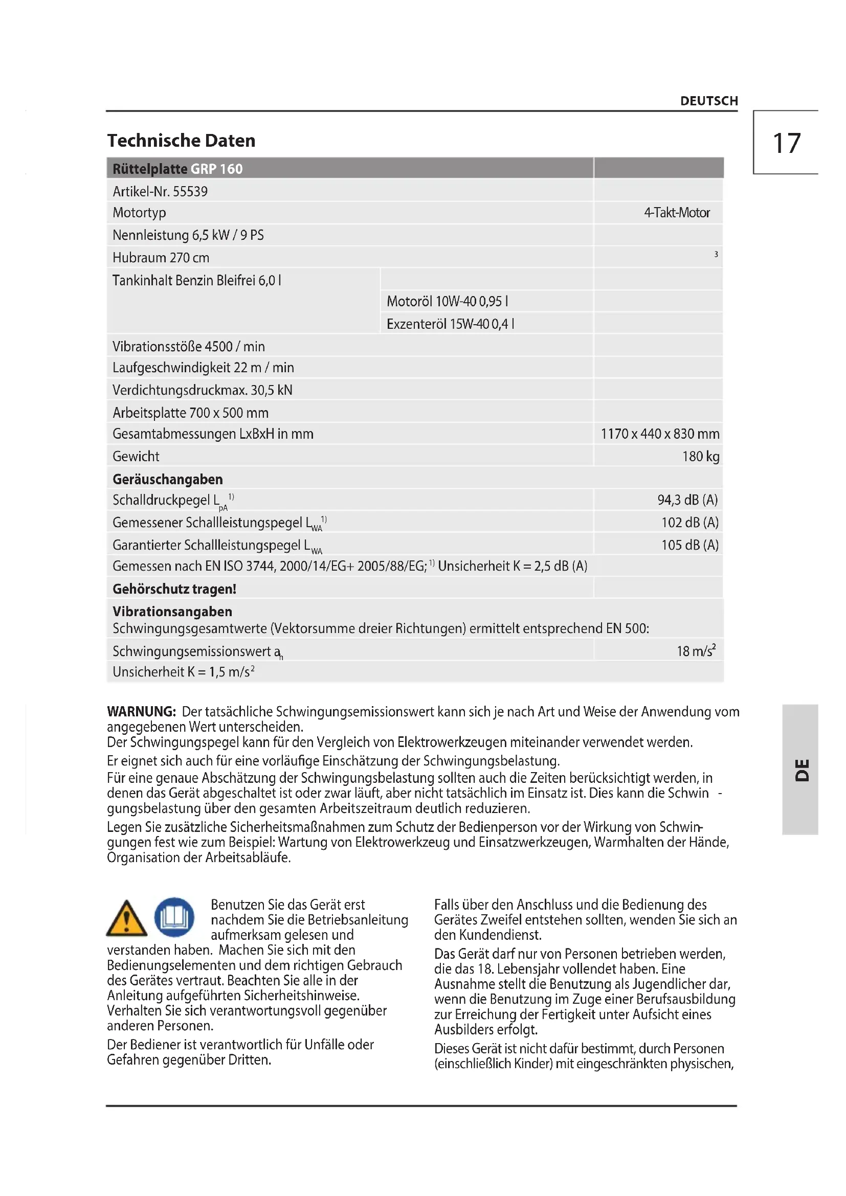Tankinhalt Benzin Bleifrei 6,0 l Motoröl 10W-40 0,95 l Exzenteröl 15W-40 0,4 l Vibrationsstöße 4500 / min Laufgeschwindigkeit 22 m / min Verdichtungsdruckmax. 30,5 kN Arbeitsplatte 700 x 500 mm Gesamtabmessungen LxBxH in mm 1170 x 440 x 830 mm Gewicht 180 kg Geräuschangaben Schalldruckpegel L
