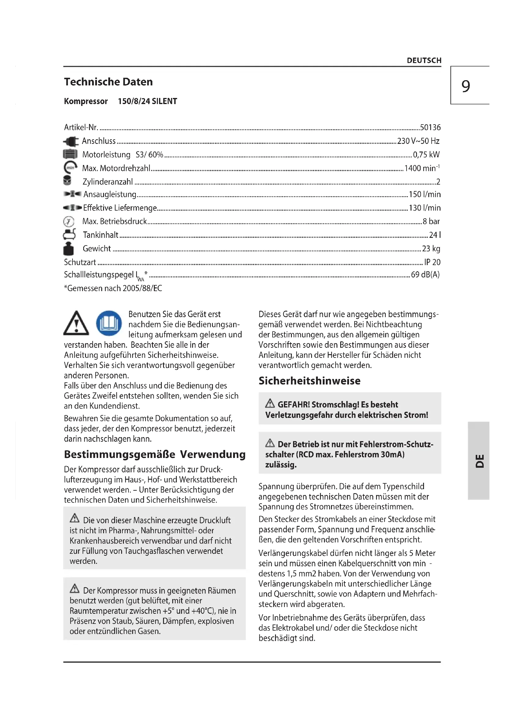 - destens 1,5 mm2 haben. Von der Verwendungvon Verlängerungskabeln mit unterschiedlicher Länge und Querschnitt,sowie von Adaptern und Mehrfach- steckern wird abgeraten. Vor Inbetriebnahme des Geräts überprüfen, dass das Elektrokabel und/ oder die Steckdose nicht beschädigt sind. DEUTSCH Technische Daten Kompressor 150/8/24 SILENT Artikel-Nr p. 5013