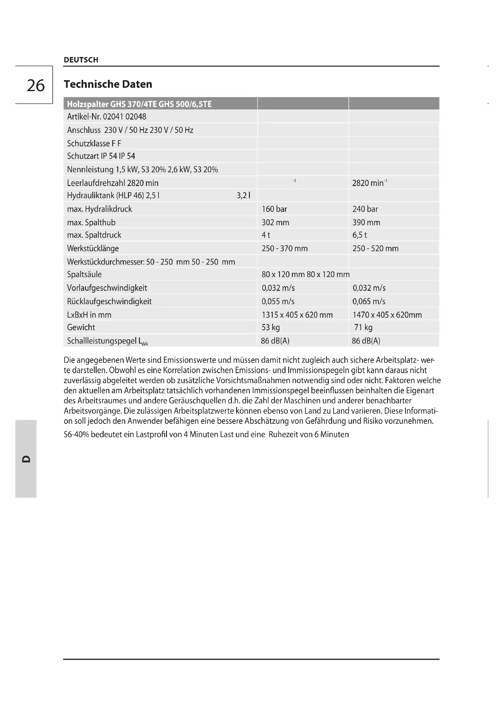 DEUTSCH Technische Daten Holzspalter GHS 370/4TE GHS 500/6,5TE Artikel-Nr. 02041 02048 Anschluss 230 V / 50 Hz 230 V / 50 Hz Schutzklasse F F Schutzart IP 54 IP 54 Nennleistung 1,5 kW, S3 20% 2,6 kW, S3 20% Leerlaufdrehzahl 2820 min