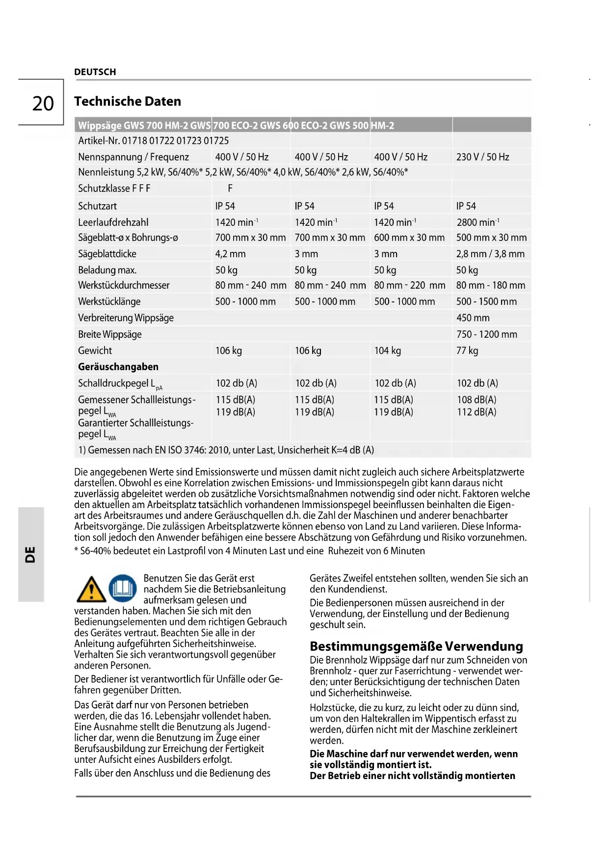 Das Gerät muss an einer 400 V Steckdose mit einer Absicherung von 16 A angeschlossen werden. GWS 500 HM-2 Das Gerät muss an einer 230 V Steckdose mit einer Absicherung von 16 A angeschlossen werden. Tragen Sie Gehörschutz. Die Einwirkung von Lärm kann Gehörverlust bewirken. Beim Hantieren mit Sägeblättern und rauenWerkstof