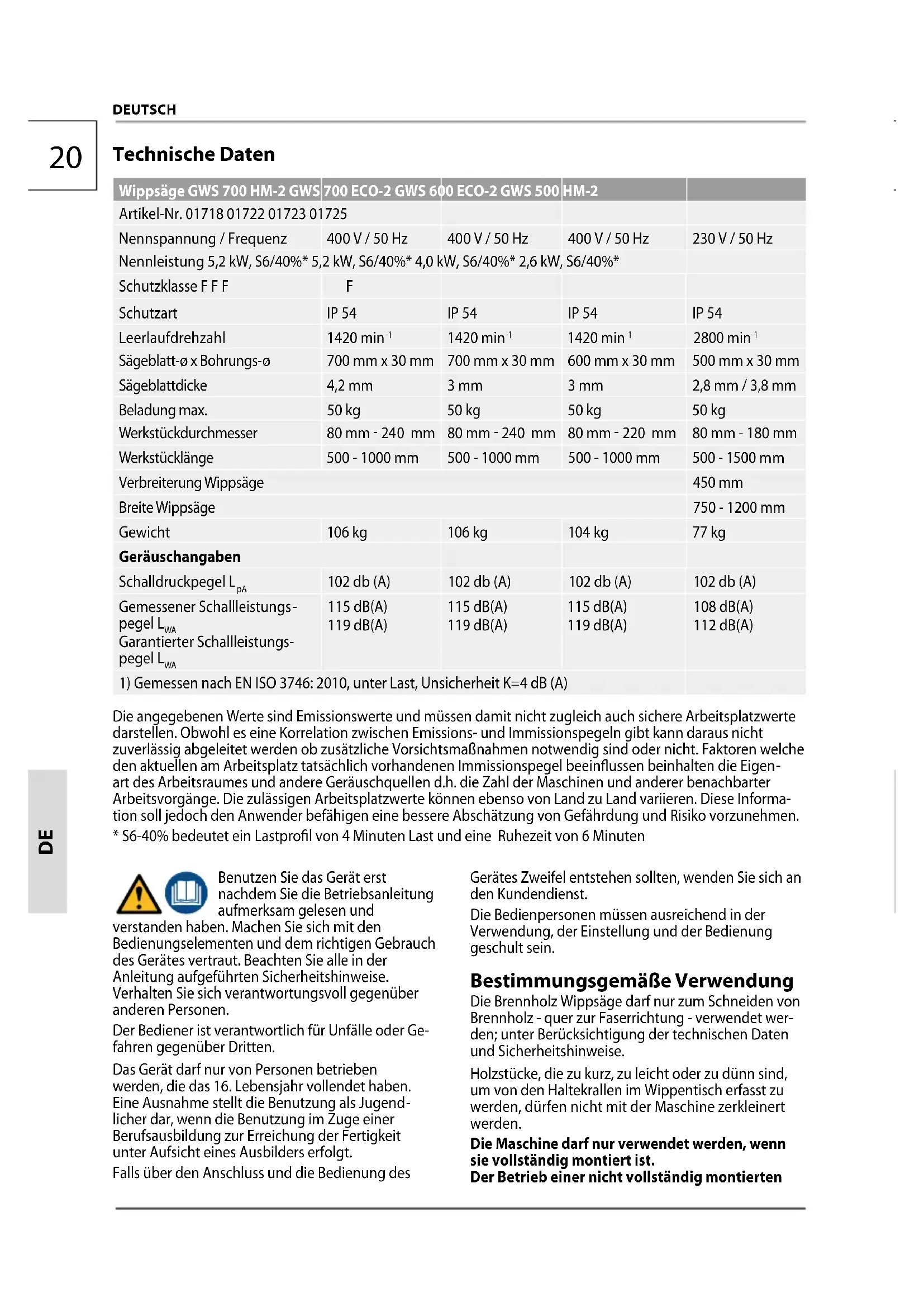 Das Gerät muss an einer 400 V Steckdose mit einer Absicherung von 16 A angeschlossen werden. GWS 500 HM-2 Das Gerät muss an einer 230 V Steckdose mit einer Absicherung von 16 A angeschlossen werden. Tragen Sie Gehörschutz. Die Einwirkung von Lärm kann Gehörverlust bewirken. Beim Hantieren mit Sägeblättern und rauenWerkstof