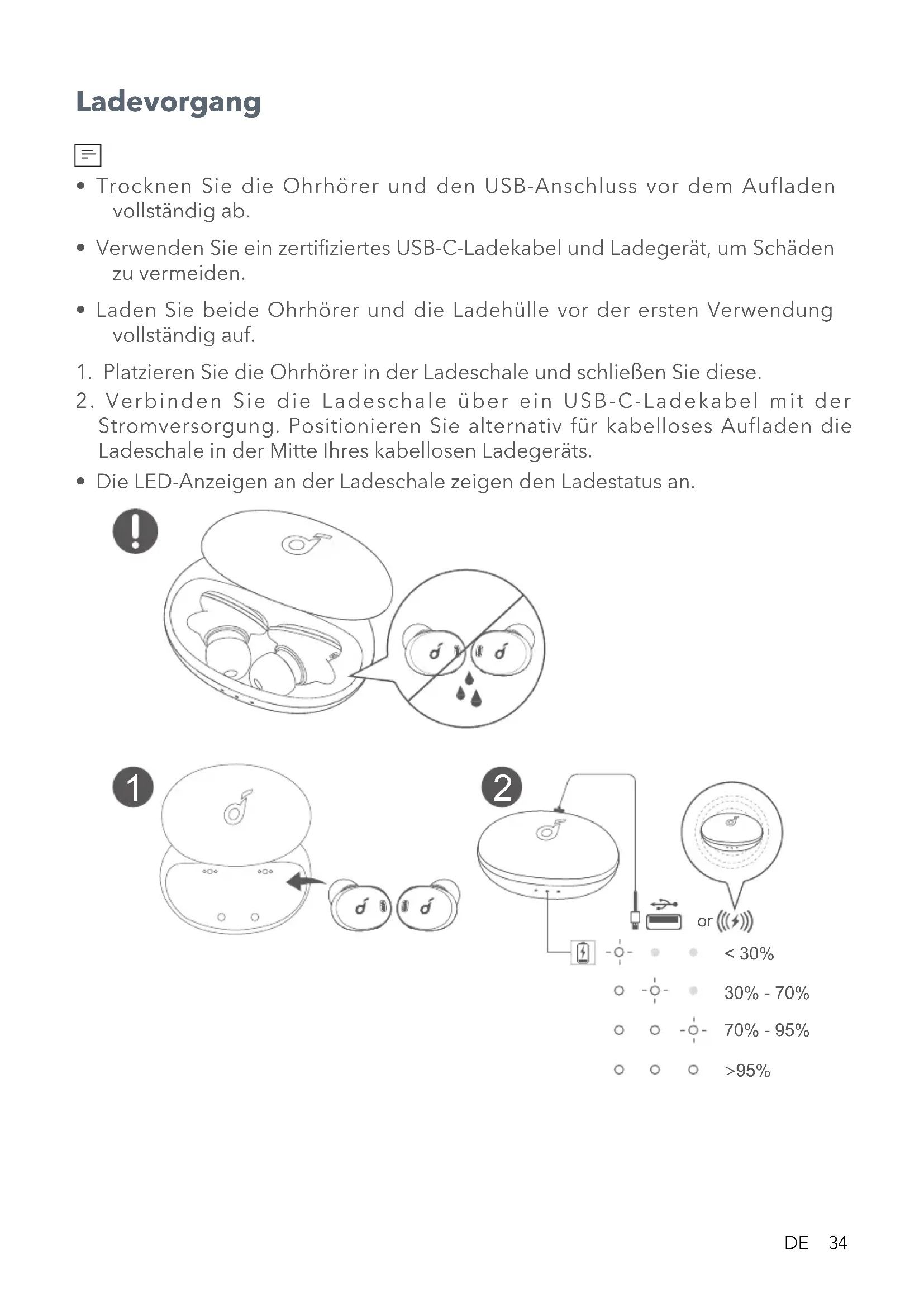 - Trocknen Sie die Ohrhörer und den USB-Anschluss vor dem Aufladen vollständig ab.