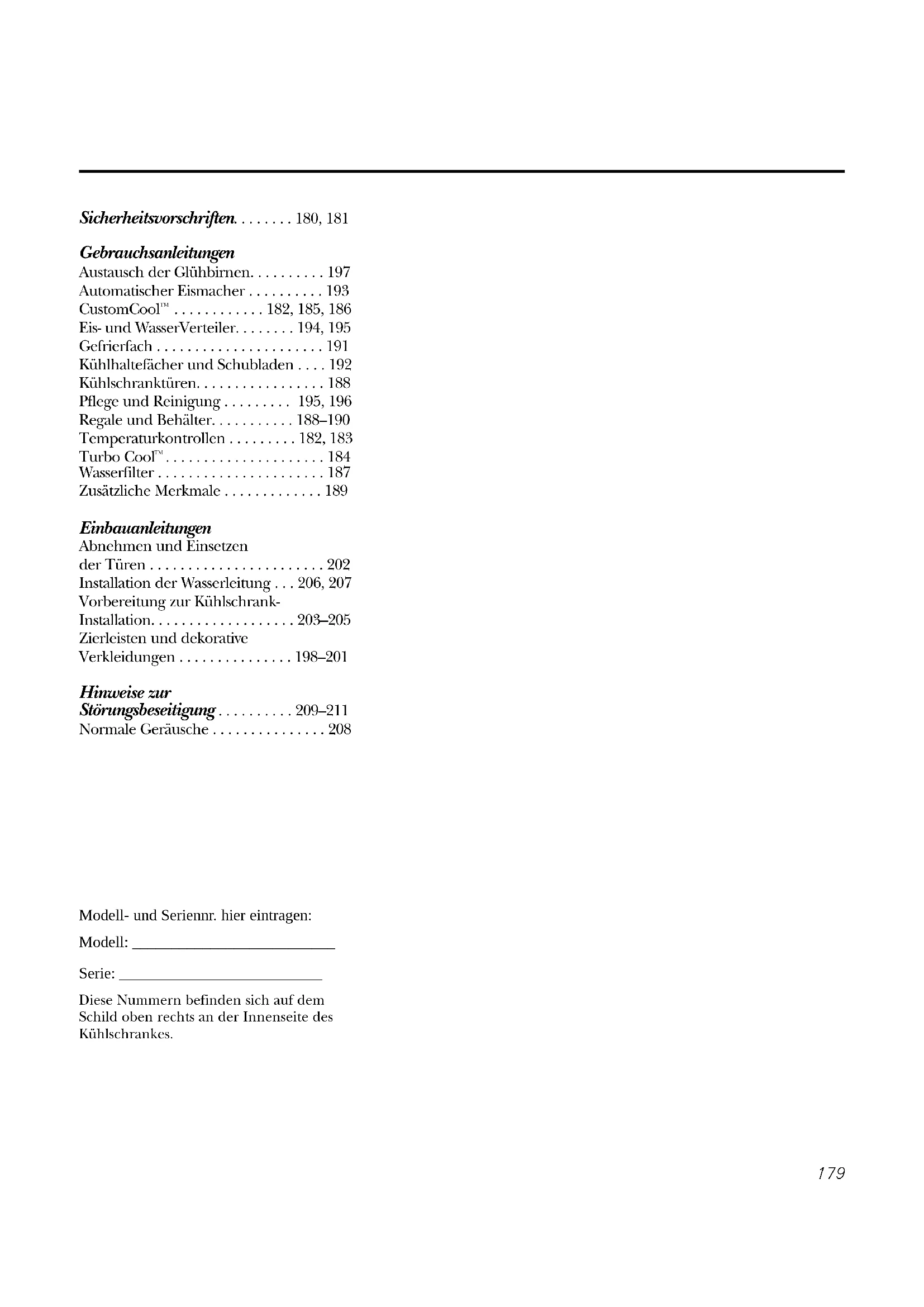 Notas.179 Sicherheitsvorschriften. . . . . . . . 180, 181 Gebrauchsanleitungen Austausch der Glühbirnen. . . . . . . . . . 197 Automatischer Eismacher . . . . . . . . . . 193 CustomCool