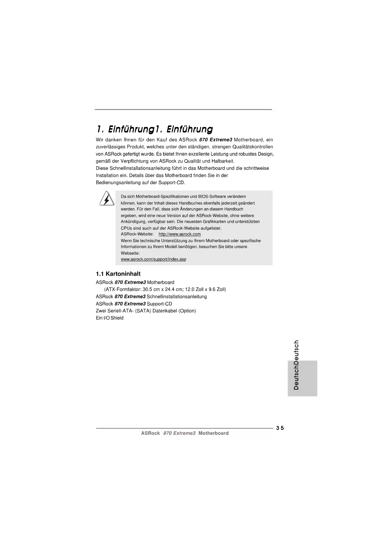 Wir danken Ihnen für den Kauf des ASRock 870 Extreme3 Motherboard, ein zuverlässiges Produkt, welches unter den ständigen, strengen Qualitätskontrollen von ASRock gefertigt wurde. Es bietet Ihnen exzellente Leistung und robustes Design, gemäß der Verpflichtung von ASRock zu Qualität und Halbarkeit. Diese Schnellinstallationsanleitung führt in das Motherboard und die schrittweise Installation ein. Details über das Motherboard finden Sie in der Bedienungsanleitung auf der Support-CD. Da sich Motherboard-Spezifikationen und BIOS-Software verändernkönnen, kann der Inhalt dieses Handbuches ebenfalls jederzeit geändertwerden. Für den Fall, dass sich Änderungen an diesem Handbuchergeben, wird eine neue Version auf der ASRock-Website, ohne weitereAnkündigung, verfügbar sein. Die neuesten Grafikkarten und unterstütztenCPUs sind auch auf der ASRock-Website aufgelistet. ASRock-Website: http://www.asrock.com Wenn Sie technische Unterstützung zu Ihrem Motherboard oder spezifischeInformationen zu Ihrem Modell benötigen, besuchen Sie bitte unsereWebseite:www.asrock.com/support/index.asp