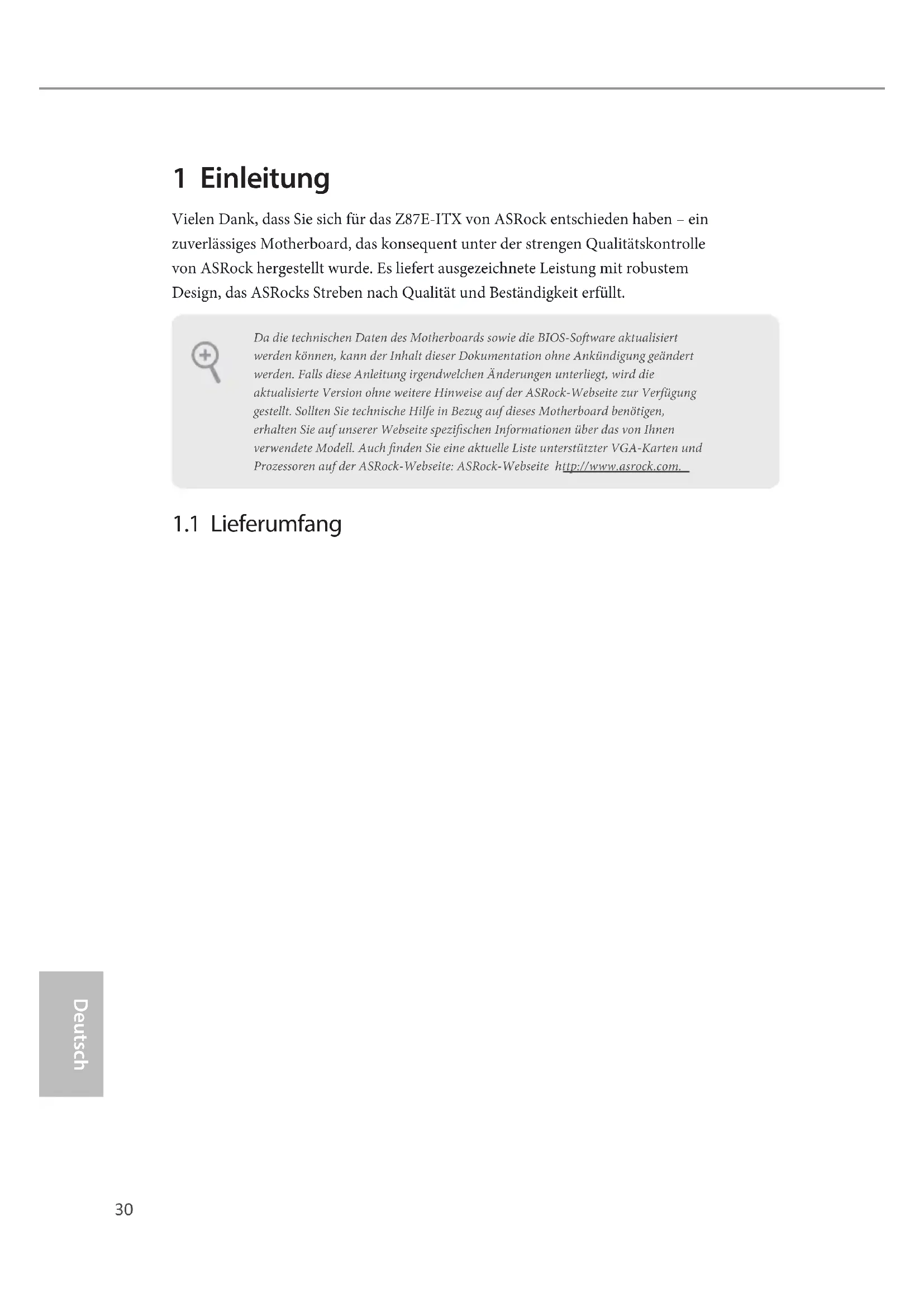 GND30 Deutsch 1 Einleitung Vielen Dank, dass Sie sich für das Z87E-ITX von ASRock entschieden haben – ein zuverlässiges Motherboard, das konsequent unter der strengen Qualitätskontrolle von ASRock hergestellt wurde. Es liefert ausgezeichnete Leistung mit robustem Design, das ASRocks Streben nach Qualität und Beständigkeit erfüllt.