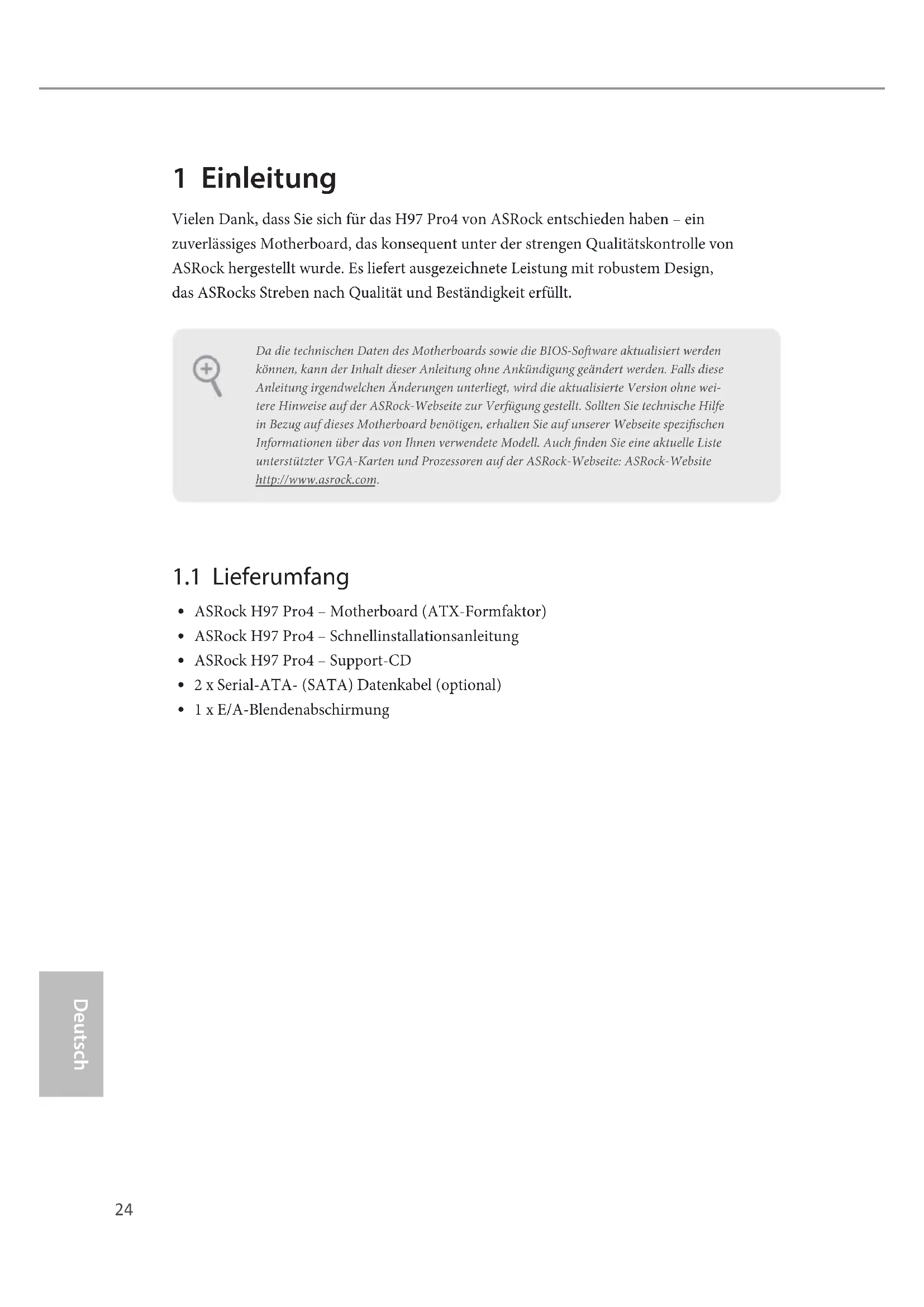 Deutsch 1 Einleitung Vielen Dank, dass Sie sich für das H97 Pro4 von ASRock entschieden haben – ein zuverlässiges Motherboard, das konsequent unter der strengen Qualitätskontrolle von ASRock hergestellt wurde. Es liefert ausgezeichnete Leistung mit robustem Design, das ASRocks Streben nach Qualität und Beständigkeit erfüllt.