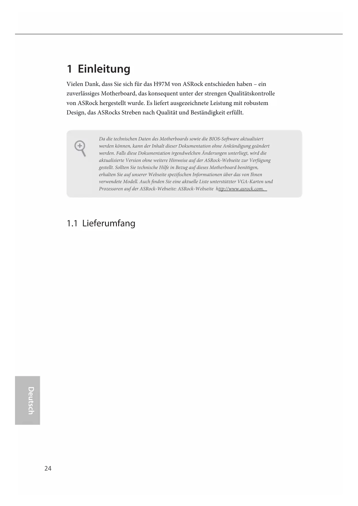 Signal GND24 Deutsch 1 Einleitung Vielen Dank, dass Sie sich für das H97M von ASRock entschieden haben – ein zuverlässiges Motherboard, das konsequent unter der strengen Qualitätskontrolle von ASRock hergestellt wurde. Es liefert ausgezeichnete Leistung mit robustem Design, das ASRocks Streben nach Qualität und Beständigkeit erfüllt.