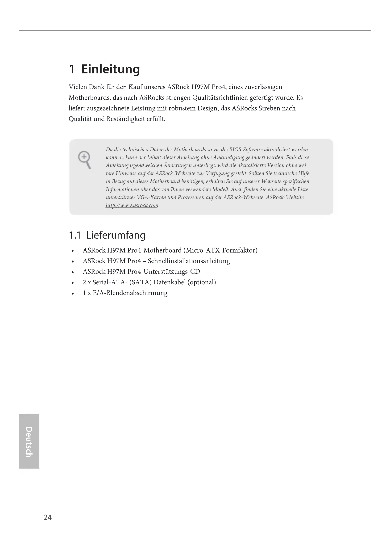 Signal GND24 Deutsch 1 Einleitung Vielen Dank für den Kauf unseres ASRock H97M Pro4, eines zuverlässigen Motherboards, das nach ASRocks strengen Qualitätsrichtlinien gefertigt wurde. Es liefert ausgezeichnete Leistung mit robustem Design, das ASRocks Streben nach Qualität und Beständigkeit erfüllt.
