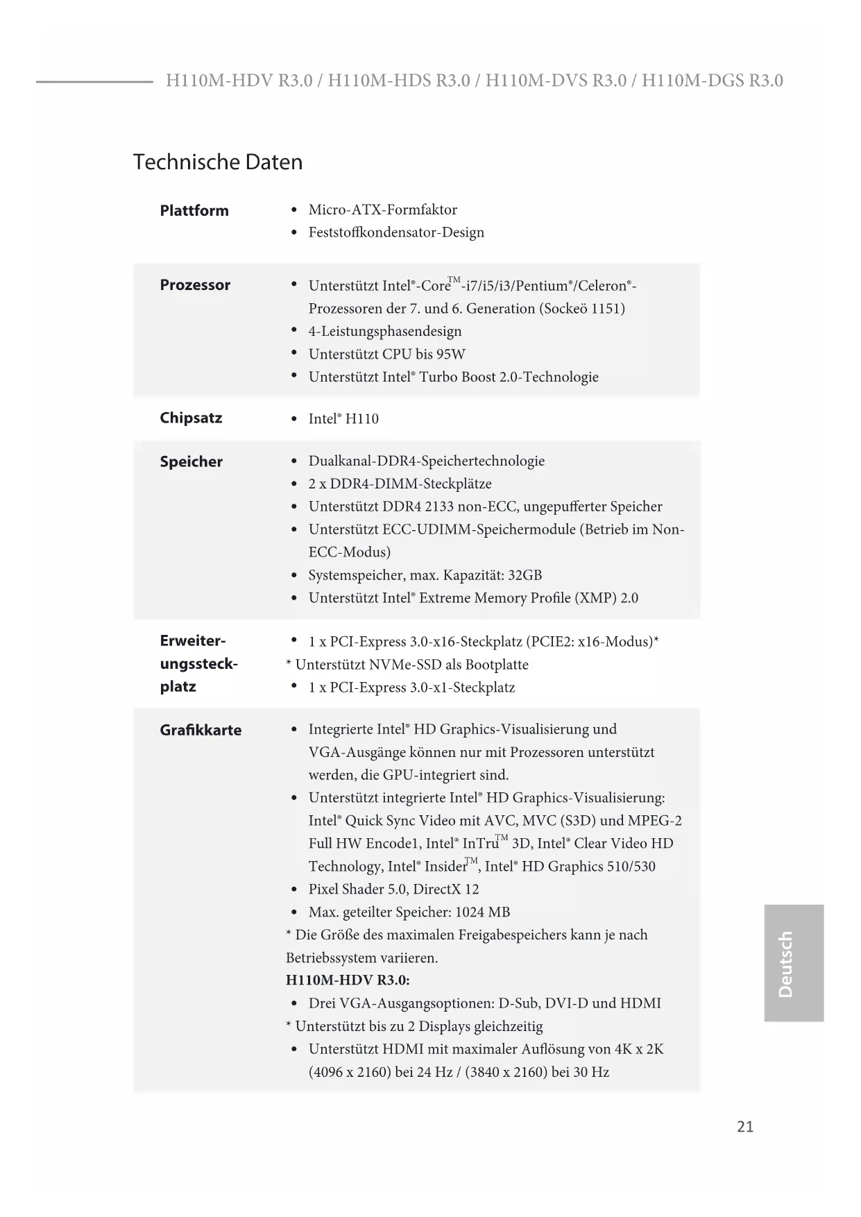 Unterstützt HDCP mit DVI-D-Port23 Deutsch H110M-HDV R3.0 / H110M-HDS R3.0 / H110M-DVS R3.0 / H110M-DGS R3.0