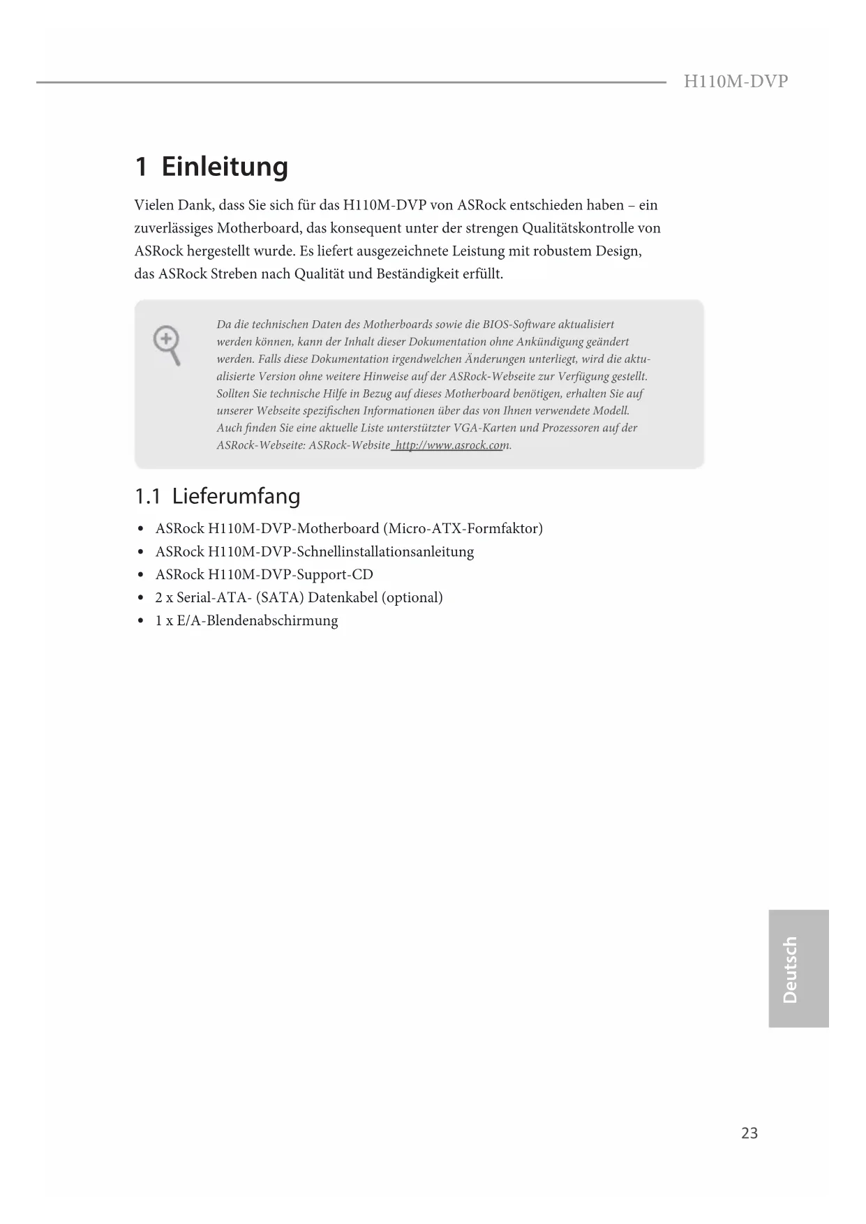 GN D SL IN#ST B#SP D0SP D1SP D2SP D3SP D4SP D5SP D6SP D7AC K#BU SY SL CT23 Deutsch H110M-DVP 1 Einleitung Vielen Dank, dass Sie sich für das H110M-DVP von ASRock entschieden haben – ein zuverlässiges Motherboard, das konsequent unter der strengen Qualitätskontrolle von ASRock hergestellt wurde. Es liefert ausgezeichnete Leistung mit robustem Design, das ASRock Streben nach Qualität und Beständigkeit erfüllt.