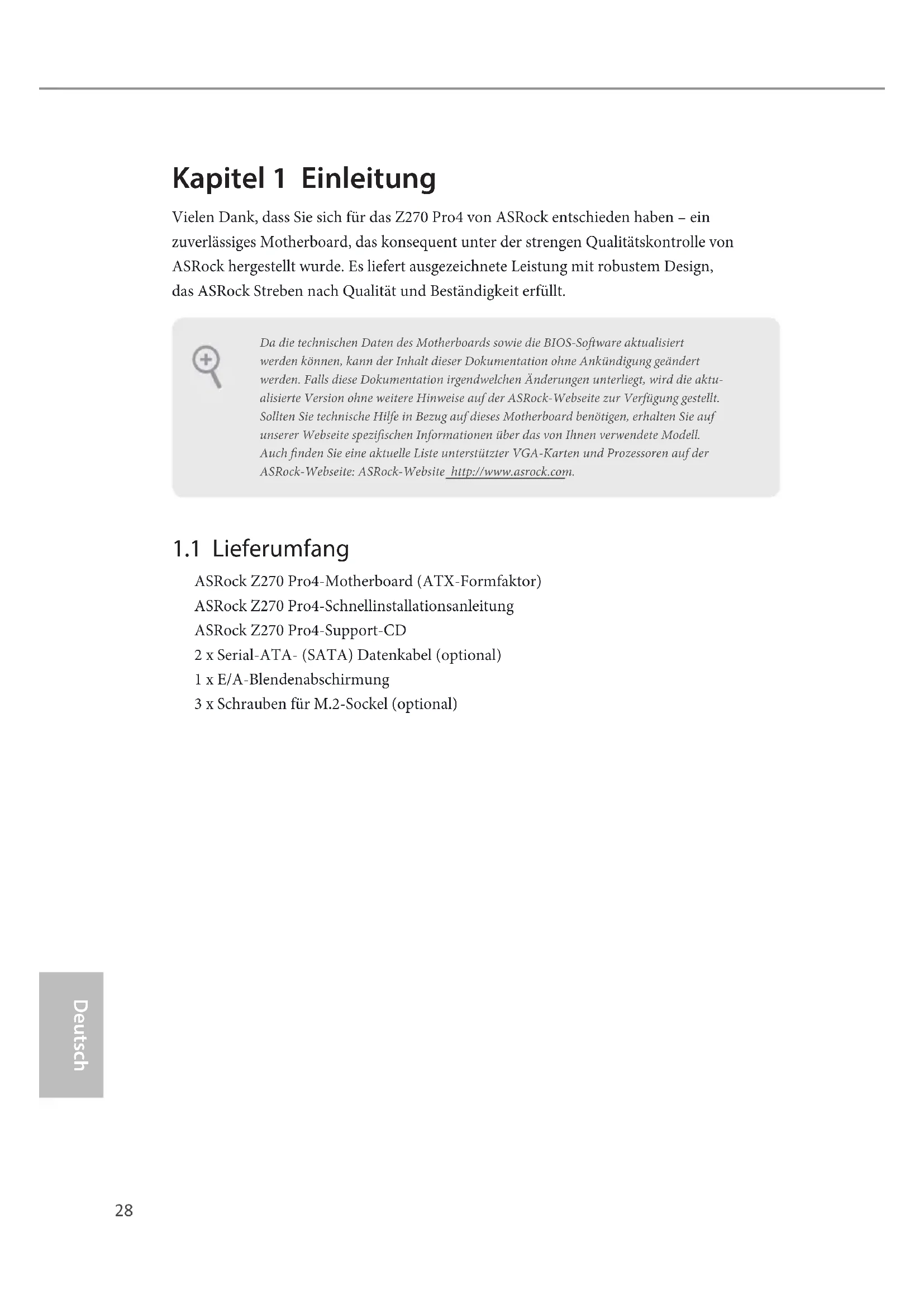 3 x Schrauben für M.2-Sockel (optional) Da die technischen Daten des Motherboards sowie die BIOS-Soware aktualisiert werden können, kann der Inhalt dieser Dokumentation ohne Ankündigung geändert werden. Falls diese Dokumentation irgendwelchen Änderungen unterliegt, wird die aktu-alisierte Version ohne weitere Hinweise auf der ASRock-Webseite zur Verfügung gestellt. Sollten Sie technische Hilfe in Bezug auf dieses Motherboard benötigen, erhalten Sie auf unserer Webseite spezischen Informationen über das von Ihnen verwendete Modell. Auch nden Sie eine aktuelle Liste unterstützter VGA-Karten und Prozessoren auf der ASRock-Webseite: ASRock-Website http://www.asrock.com.29 Z270 Pro4 Deutsch